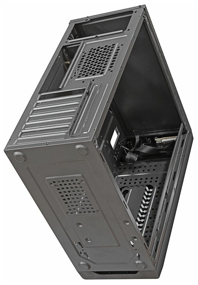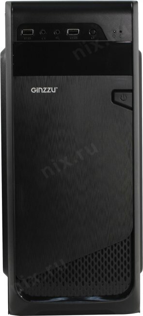 Корпус Ginzzu выполнен из стали 0,45 мм в черном цвете. Он имеет отличную жесткость конструкции за счет 2-ной клепки узловых соединений с фигурным теснением. Наличие кабельных каналов дает возможность аккуратно проложить провода питания элементов ПК. Такая укладка придает элегантный вид собранного компьютера, обеспечивает беспрепятственный доступ воздуха к компонентам системы для ее качественного охлаждения.