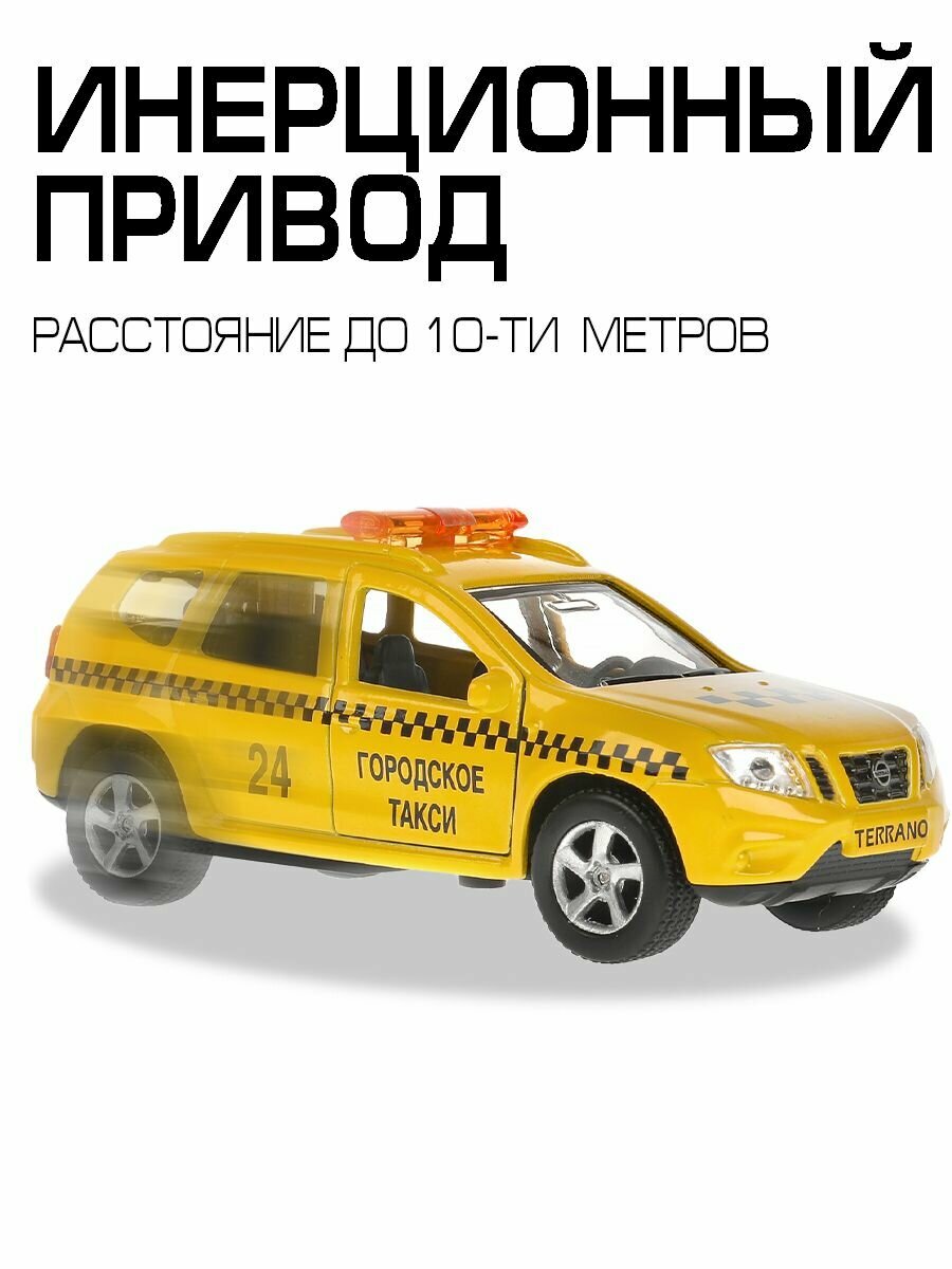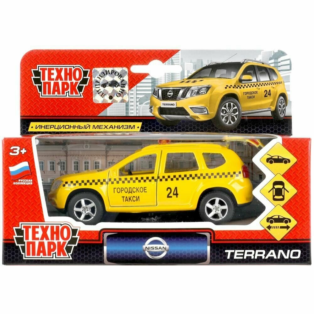 Инерционная машина «Nissan Terrano» исполненная в дизайне автомобиля из службы городского такси сразу заинтересует ценителя реалистичных моделей от российского бренда «Технопарк». Автомобиль имеет яркий дизайну и достоверное детальное исполнение, придающее ему сходство с его реальным прототипом.Особенности:- Если ребенок коллекционирует реалистичные модели машинок от компании «Технопарк», он будет в восторге от автомобиля, исполненного в дизайне такси, которым можно дополнить свою коллекцию.- Модель исполнена с высокой степенью детализации, полностью повторяет оригинальный прототип Nissan Terrano.- Корпус машинки имеет яркий желтый цвет и декорирован характерными черными шашечками, обозначающими такси. На дверях имеется надпись «Городское такси», а на крыше установлены маячки.- Детям будет интересно открыть багажник и двери автомобиля, рассматривая, как воссоздан его салон.- Благодаря подвижным колесам с рельефным рисунком протектора, игрушку можно катать по ровной поверхности.- Инерционный механизм движения поможет придавать машинке ускорение.- Играя с машинкой, ребенок придумает захватывающие фантазийные сюжеты, потренирует координацию движений, ловкость и моторику рук.- Дети получат незабываемые впечатления и прекрасное настроение от игры с машинкой.- Для изготовления модели использовался ударопрочный металл и пластик, окрашенный в яркие цвета устойчивыми к истиранию красителями.