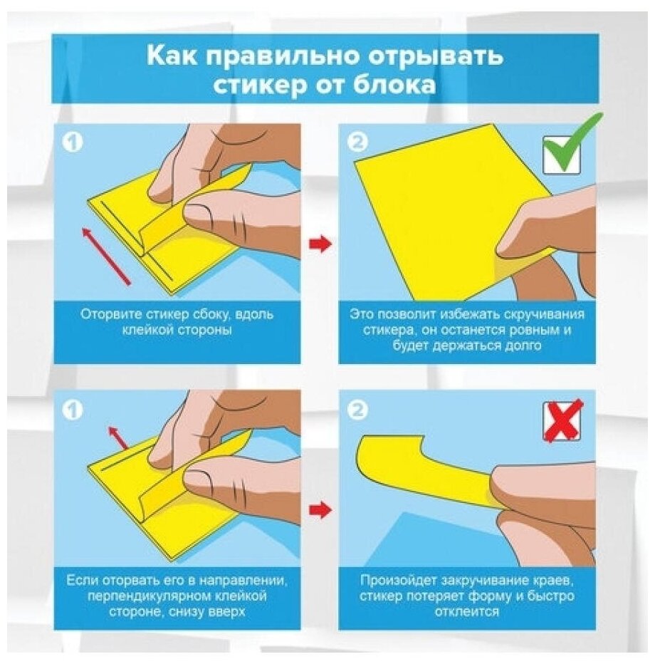 - Отделяйте листы от блока вдоль клеевой полосы, в горизонтальном направлении. Это поможет избежать скручивания и последующего отклеивания стикера.