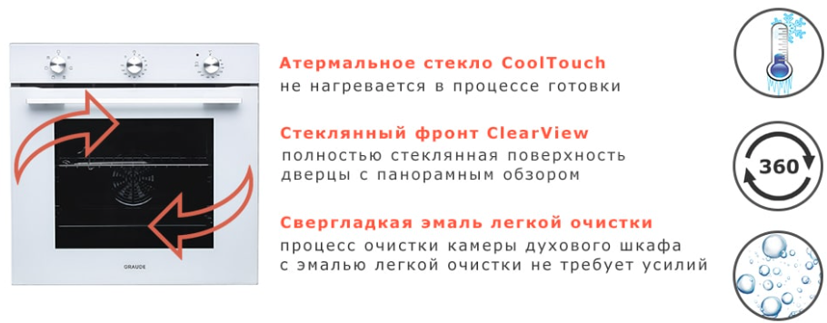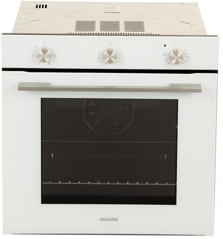 Graude BE 60.2 – электрический духовой шкаф с 73-литровой камерой. Он подходит для приготовления больших порций. Благодаря стильному дизайну эта модель хорошо вписывается в современный интерьер., Пять рабочих режимов позволяют радовать себя и близких людей вкусной и разнообразной едой. Благодаря конвекции у вашей выпечки будет красивая румяная корочка, а с грилем вы получите горячие бутерброды и жареное мясо и рыбу., Электронно-механическая система управления даёт возможность быстро устанавливать важные параметры. В этой модели предусмотрен звуковой таймер выключения, поэтому вам не нужно постоянно следить за временем., В устройстве реализована технология EcoClean. Жир, попадающий на внутреннюю стенку со специальным покрытием, расщепляется под воздействием высокой температуры, и вам остаётся лишь протереть поверхности губкой или салфеткой.