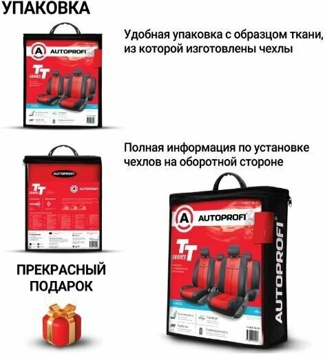 Автомобильные чехлы AUTOPROFI TT выполнены из прочного полиэстера. Изделия надежно защищают сиденья авто от загрязнений и повреждений. Чехлы имеют универсальный размер и подходят под большинство сидений.