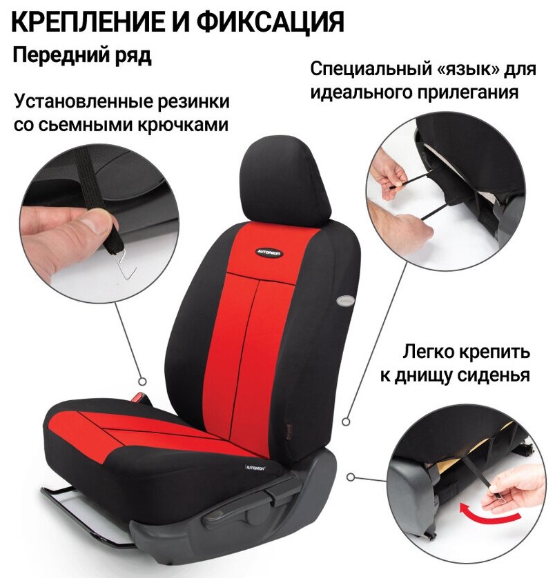 Универсальный размер подходит большинству автомобильных сидений. Есть специальный распускаемый шов для боковых подушек Airbag на передних сиденьях.