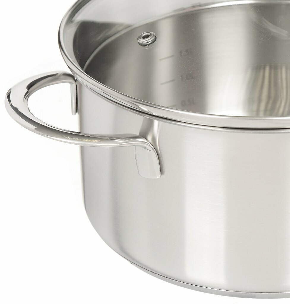 Материал кастрюли - высококачественная нержавеющая сталь 18/10, толщина дна 3,5 мм (дно капсулированное), толщина стенки 0,6 мм.