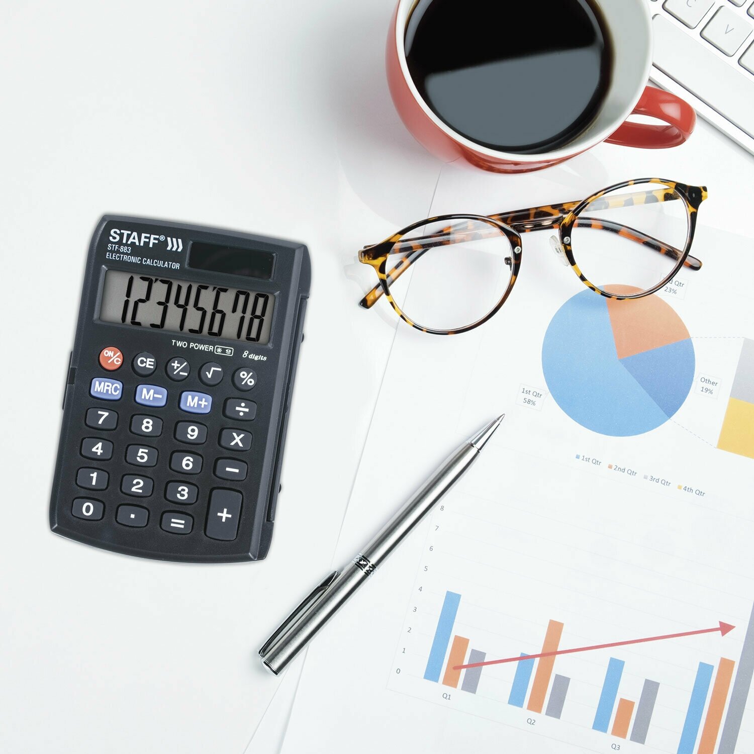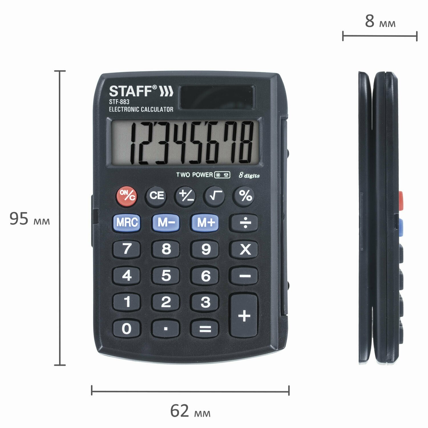 Тип: Калькулятор; Тип исполнения: настольный; Питание: Батарейка; Разрядность дисплея: 8-разрядный; Специальные функции: вычисление процентов; Описание: Калькулятор STAFF STF-883 является идеальным приобретением для студентов и школьников, поскольку позволяет осуществлять все возможные арифметические вычисления. Прибор выполнен в компактном пластиковом корпусе и поддерживает настольную установку. Благодаря наличию защитной крышки вы сможете легко переносить устройства в сумке: он надолго сохранит привлекательный вид даже при тесном контакте с различными аксессуарами. Крышка обеспечивает защиту дисплея и панели с кнопками от повреждений., STAFF STF-883 использует широкий дисплей для отображения результатов вычислений. На нем помещается 8 цифр, что позволит производить на калькуляторе средние вычисления. Устройство поддерживает также вычисление квадратного корня и вычисление процентов. На панели предусмотрены кнопки для работы с памятью. Благодаря автоматическому выключению происходит экономия ресурса, что позволяет калькулятору работать дольше. Он получает питание от гальванической батареи и светочувствительного элемента.; Цвет: черный; Размер: 105x72x10 мм
