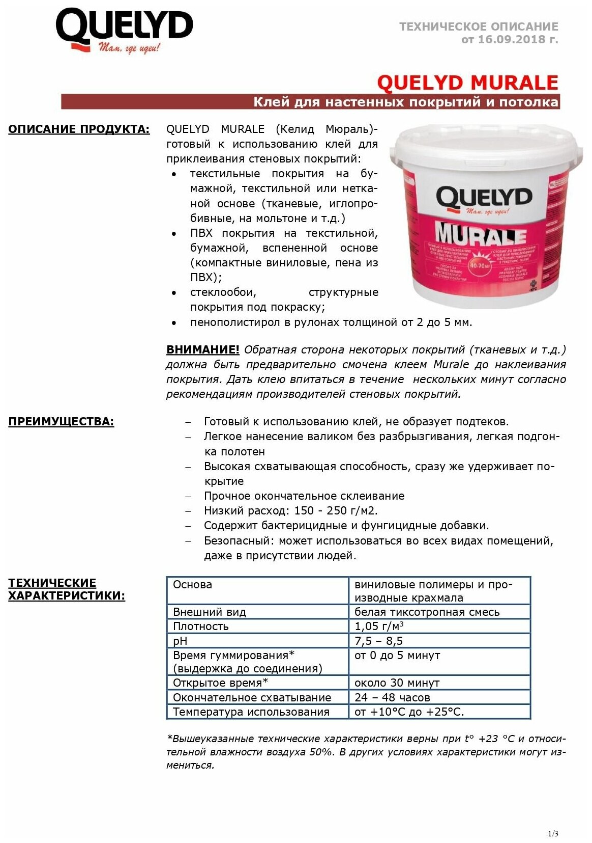 Quelyd Murale (Келид Мюраль) - профессиональный готовый к использованию клей для стеновых покрытий идеально подходит для приклеивания текстильных покрытий на нетканой или текстильной основе, ПВХ покрытий (текстильная, бумажная, вспененная основа), стеклообоев, структурных покрытий под окраску, пенополистирола в рулонах толщиной от 2 до 5 мм. ЗОНЫ ПРИМЕНЕНИЯ Для текстильных покрытий на бумажной, текстильной или нетканой основе (тканевые, иглопробивные, на мольтоне и т.д.); Для ПВХ-покрытий на текстильной, бумажной, вспененной основе (компактные виниловые, пена из ПВХ); Для стеклообоев, структурных покрытий под покраску; Для пенополистирола в рулонах толщиной от 2 до 5 мм.