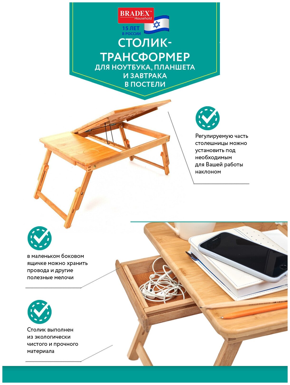 Bradex Столик-трансформер для ноутбука планшета и завтрака в постели – удобный и многофункциональный предмет интерьера. Особенности: Столик выполнен из экологически чистого и прочного материала (бамбук). Сдержанный дизайн столика позволит ему легко вписаться в любой интерьер. Телескопические ножки позволяют регулировать высоту столика (17 – 25,5 см.). Регулируемую часть столешницы можно легко установить под необходимым для Вашей комфортной работы наклоном. Столик позволяет работать в положении лёжа, благодаря чему Вы снизите нагрузку на мышцы спины и шеи. Наличие на фиксированной части столешницы специального углубления позволяет разместить на ней стакан или кружку, а в маленьком боковом ящичке можно хранить провода и другие полезные мелочи. Специальные отверстия на регулируемой части столешницы позволяют осуществлять вентиляцию и отвод тёплого воздуха от ноутбука/планшета. Столик - трансформер станет отличным подарком для родных, друзей и коллег.