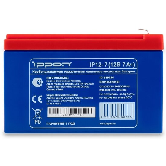 Батарея для ИБП Ippon IP12-7 12Вт 7Ач для Ippon он предназначен для обеспечения резервным питанием систем охраны и безопасности, телекоммуникационного оборудования, промышленных объектов широкого назначения, работы в источниках бесперебойного питания.