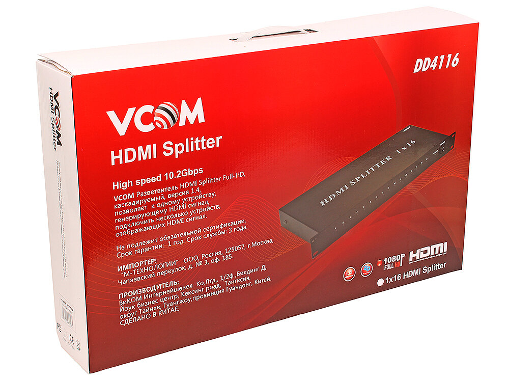 Сплиттер HDMI VCOM 3D Full-HD 1.4v 1 компьютер - 16 мониторов каскадируемый DD4116 VCOM Telecom