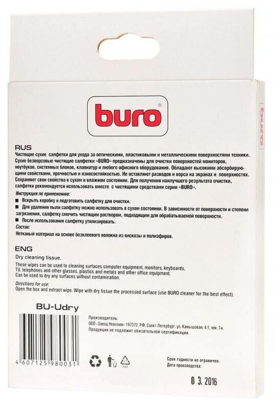 Чистящие салфетки BURO BU-UDRY 20 шт Салфетки BU-Udry для удаления пыли