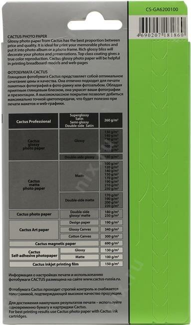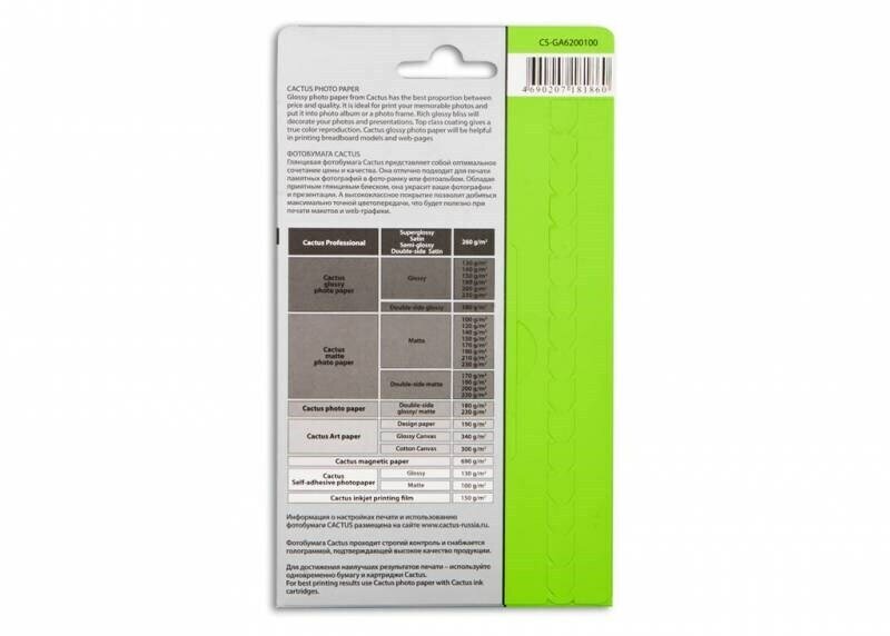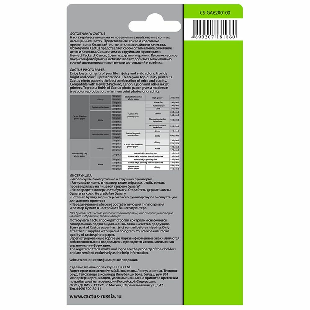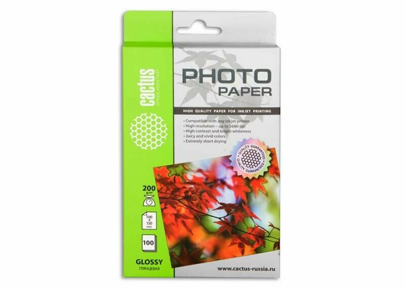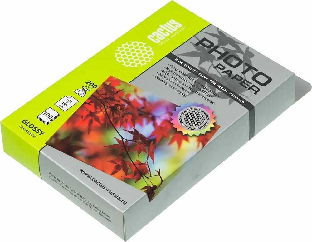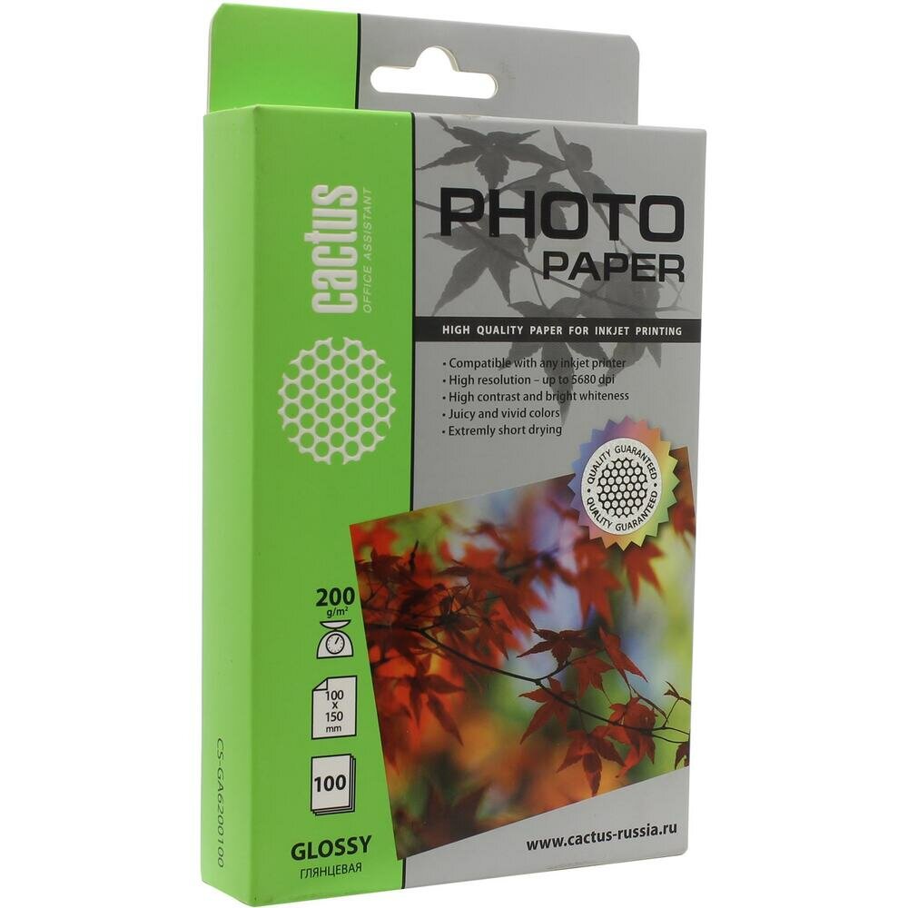 Бумага Cactus CS-GA6200100 10x15см 200г/кв.м глянцевая 100л CS-GA6200100 10x15 200г м2 100л. белый глянцевое для струйной печати
