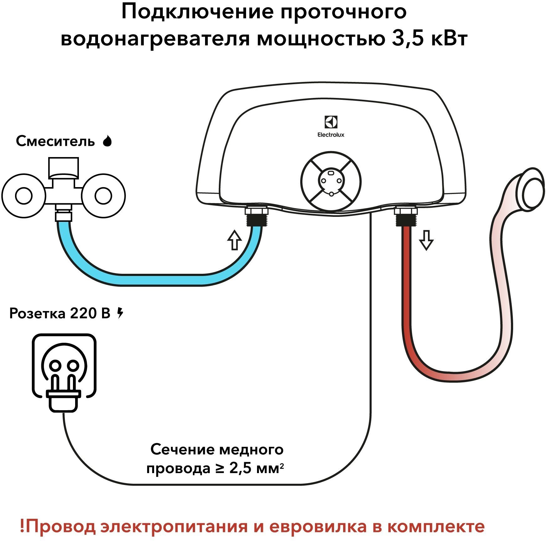 Великолепно подходит на период отключение горячей воды. Прост в монтаже и подключении, автоматически включается подогрев при поступлении воды и выключается при ее отсутствии, что позволяет использовать детьми без какого либо дополнительного контроля. Однако провод лучше использовать сечением от 2,5 мм2 (1,5 мм2 сильно греется при длительном использовании и может привести к беде). Для подогрева до 25-30 градусов напора достаточно, чтобы промыть длинные волосы. Не советую покупать меньшей мощности - из холодной вода получится прохладной даже при минимальном напоре.