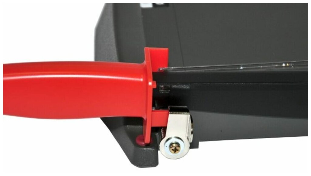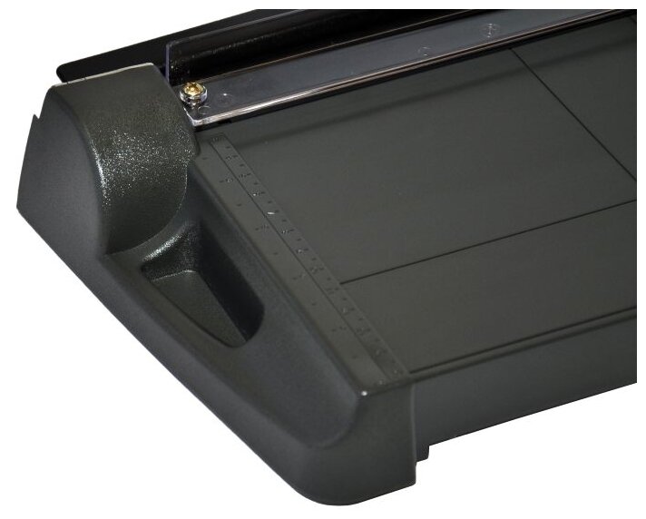 Сабельный нож, заключенный в пластиковый корпус, защитный экран отсутствует. Рабочий стол резака имеет разметку в мм/дюймы, а также разметку форматов от А4 до А6.
