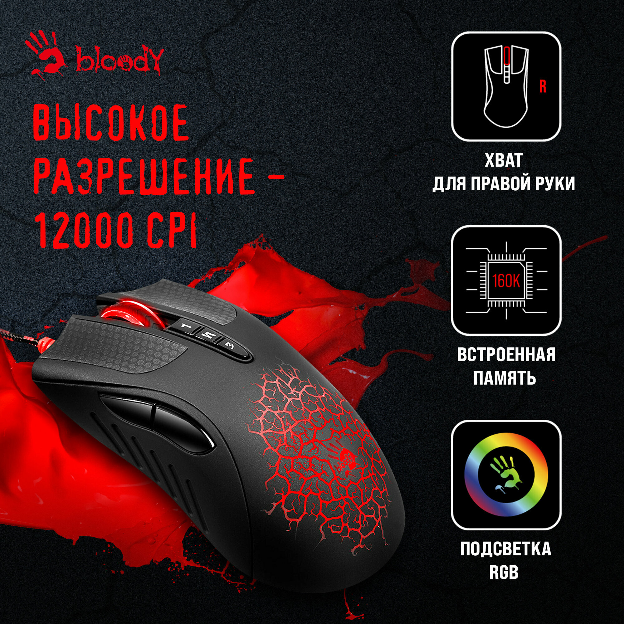 - Мышь A4 Bloody AL9 Blazing. Игровая, лазерная, проводная, USB, черный.