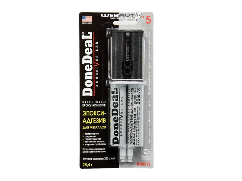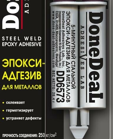 5-минутный эпокси-адгезив обеспечивает качественное и надежное соединение.Быстро и надежно склеивает в любых сочетаниях металлы, сплавы, большинство пластиков, керамику, стекло, дерево, различные строительные материалы.После полимеризации безвреден, устойчив к воздействию нефтепродуктов, воды, растворителей.Обладает хорошими эксплуатационными характеристиками, не дает усадки, выдерживает постоянные и переменные нагрузки в интервале температур от -55 до +150°С.Прочность соединения: 250 кг/см.применение: Очистите соединяемые поверхности от загрязнений. Обработайте наждачной бумагой, обезжирьте и высушите. Удалите колпачок-фиксатор из рукоятки диспенсера. Выдержите диспенсер в вертикальном положении, носиками вверх, пока пузырьки воздуха полностью не поднимутся. Отломите кончики носиков шприцев и, держа диспенсер в вертикальном положении, удалите воздух нажатием на поршень. Выдавите (диспенсер автоматически дозирует нужное соотношение компонентов) и тщательно перемешайте состав на чистой непористой поверхности в течение 1 минуты. Нанесите приготовленную смесь тонким равномерным слоем на обе склеиваемые поверхности. Время с момента приготовления смеси до окончательной фиксации обрабатываемых поверхностей (см. п. 7) не должно превышать 1—2 минут. Соедините склеиваемые поверхности деталей и зафиксируйте их в сжатом состоянии на 5 минут. Немедленно удалите избыток состава с помощью уайт-спирита или другого аналогичного растворителя. Полимеризация адгезива происходит в течение 30 минут после начала склеивания деталей. При пониженной температуре время отвердевания увеличивается, при повышенной — уменьшается. 90—95 % прочности и твердости при +20 °С достигается за 5—6 часов. Состав полностью отвердевает через 12—16 часов. После окончания работ слегка вытяните поршень обратно, очистите и закройте носики шприцев колпачком (см. п. 2). Храните в сухом прохладном помещении в вертикальном положении, носиками вверх. Вскрытую упаковку желательно использовать в течение 1 года.примечание:Храните и используйте препарат при температуре от +15 до +35° С.состав: Эпоксидные смолы, меркаптан, ускоритель отверждения DPM-30, бис (диметиламино) метил фенол, функциональные добавки, составляющие ноу-хау компании. Внимание: Применяйте в условиях хорошей вентиляции. Не допускайте попадания на кожу и в глаза! При попадании на кожу промойте водой с мылом. При попадании в глаза обильно промойте водой и обратитесь к врачу. При проглатывании дайте пострадавшему воды или молока и немедленно обратитесь к врачу. После использования или окончания срока годности утилизируется как бытовые отходы. Хранить в недоступном для детей месте!
