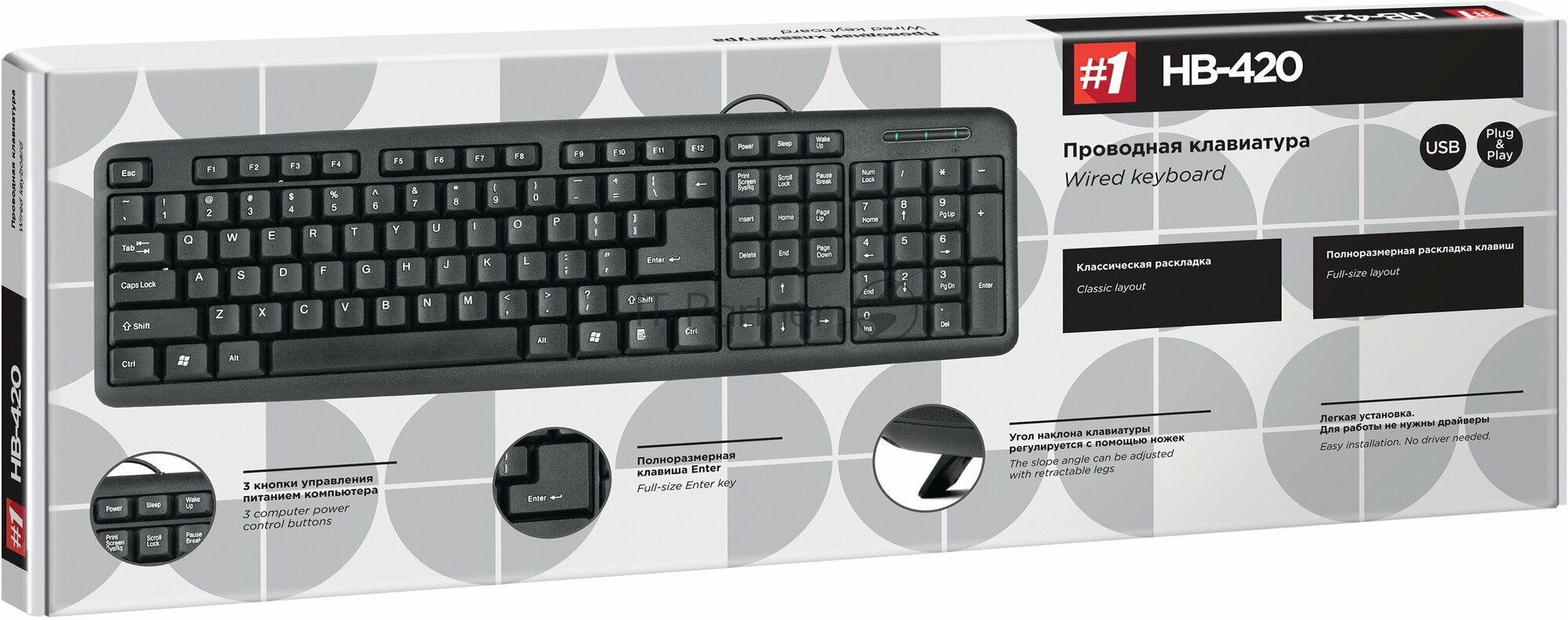 Defender HB-420 RU Black 45420 это классическая проводная клавиатура, способная удовлетворить потребности рядового пользователя. Рассматриваемая модель подключается к персональному компьютеру при помощи интерфейса USB. За счет специальных ножек осуществляется регулировка угла наклона. Клавиатура обладает британской раскладкой клавиш («Enter» занимает два ряда клавиатуры, а в основном ряду на одну клавишу больше). Цифровой блок и светодиодные индикаторы "CapsLock", "NumLock", "Scroll Lock" традиционно расположились в правой части рабочего пространства. Клавиатура не обладает какими-либо дополнительными клавишами/функциями, за счет чего станет отличным вариантом для использования как в офисе, так и дома. Комфортно работайте с текстом, переписывайтесь с друзьями и многое другое.