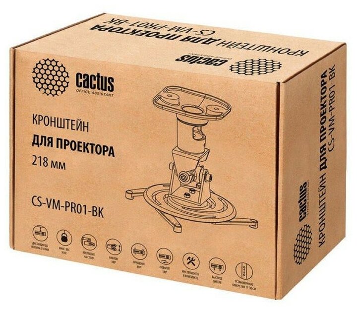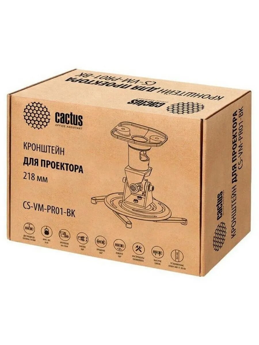 Кронштейн для проектора Cactus CS-VM-PR01 с настенным или потолочным креплением предоставляют возможность максимально эффективного размещения проекционного оборудования в помещении. Кронштейны Cactus изготовлены из алюминия или стали, что гарантирует прочность конструкции при небольшом собственном весе. Дистанция до потолка/стены: 218 мм, наклон: 180 градусов, вращение: 360 градусов, поворот: 180 градусов, установочные отверстия: 17-30 см.