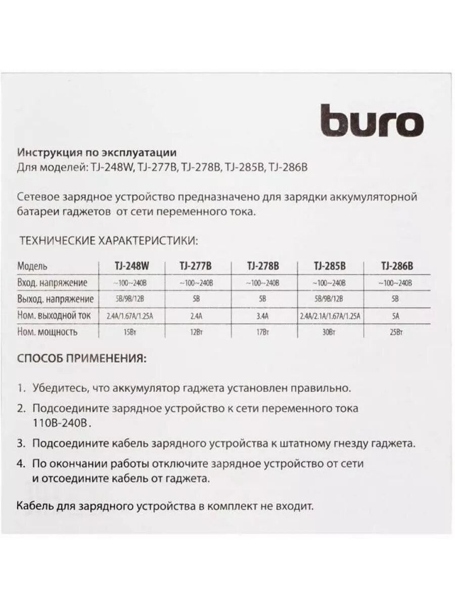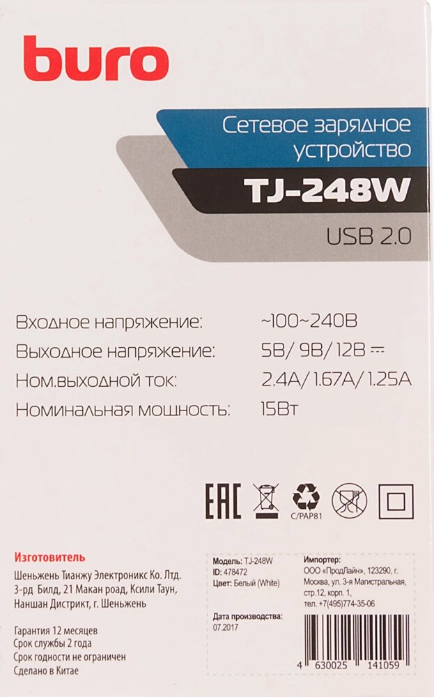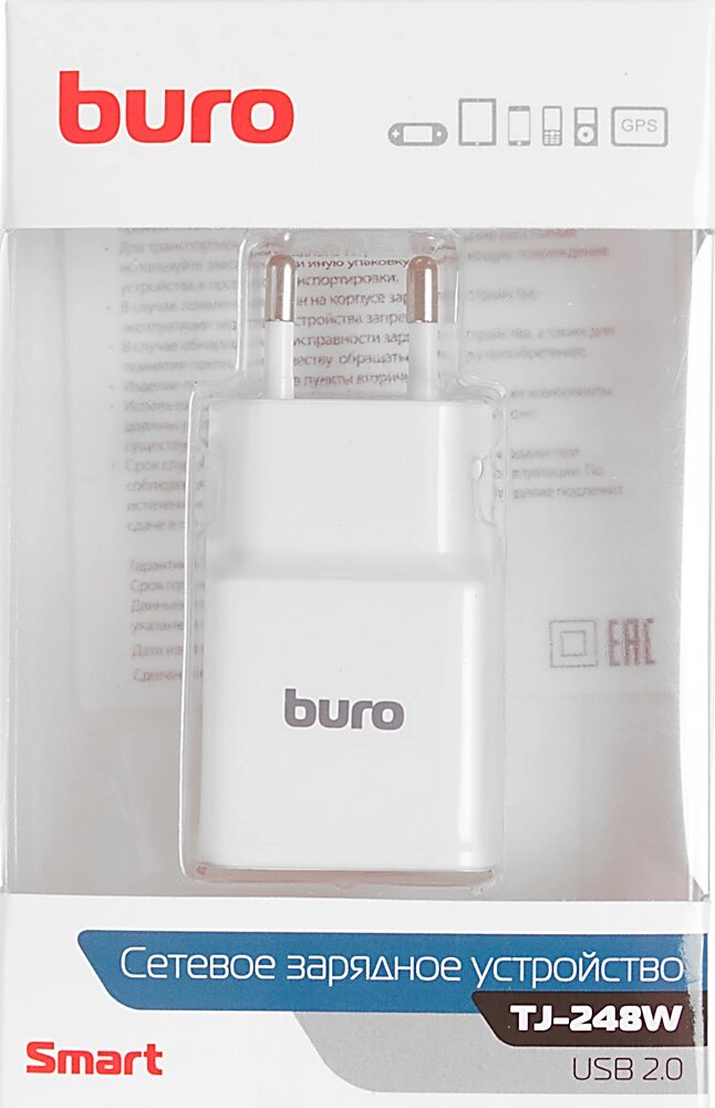 Сетевое зарядное устройство BURO TJ-248W 2.4А USB белый