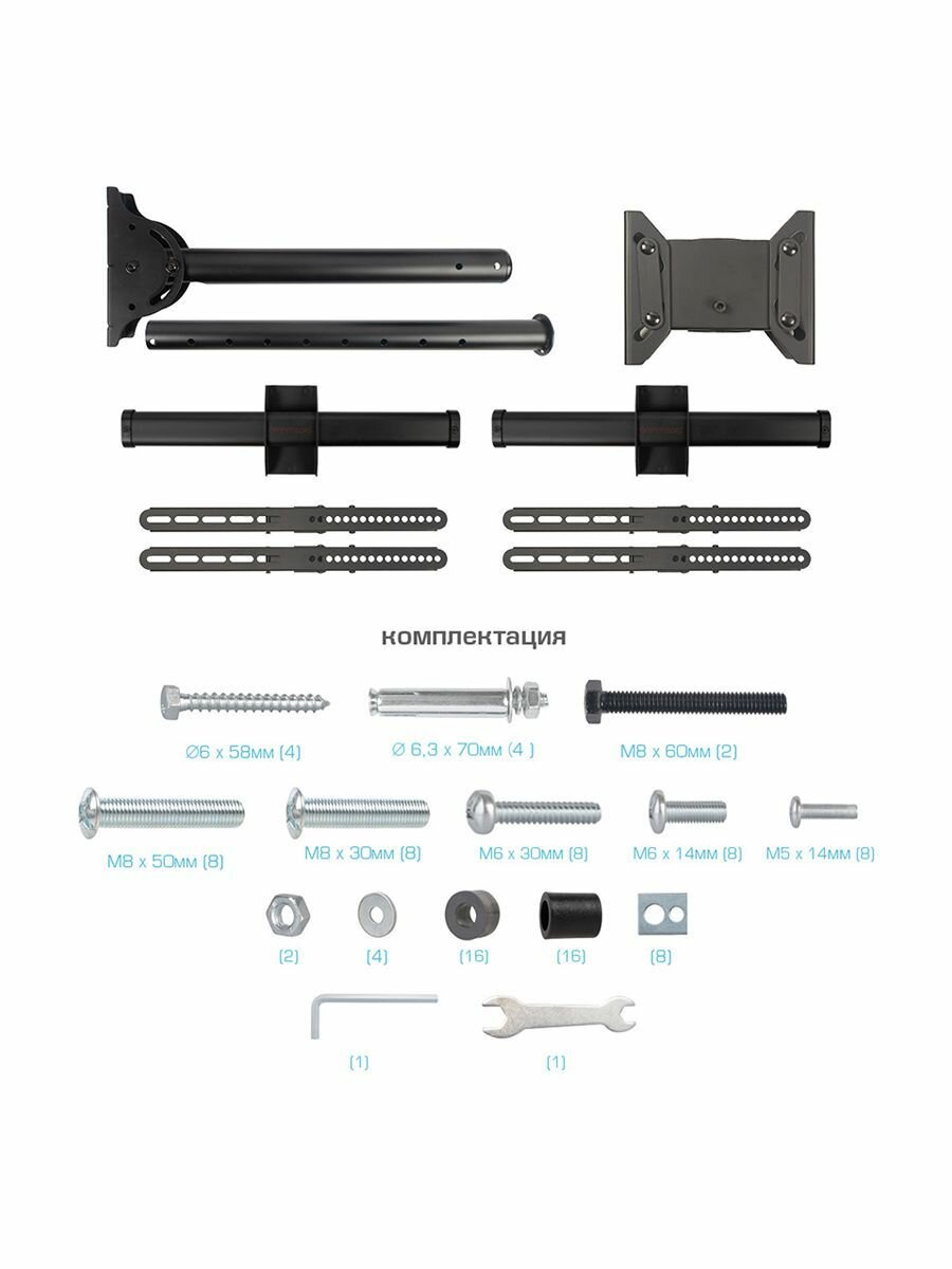 | Совместим с телевизорами | 26", 27", 28", 29", 30", 31", 32", 33", 34", 35", 36", 37", 38", 39", 40", 41", 42", 43", 44", 45", 46", 47", 48", 49", 50", 51", 52", 53", 54", 55", 56", 57", 58", 59", 60", 61", 62", 63", 64", 65" |