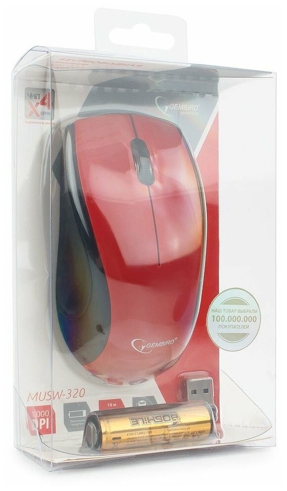 Gembird MUSW-320-R имеет стандартный набор органов управления 2 кнопки и колесико. Мышь осуществляет питание от батарейки, которая уже имеется в комплекте поставки.