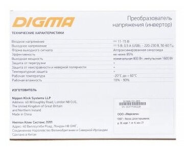 Автоинвертор Digma DCI-800- это устройство, предназначенное для преобразования входного постоянного напряжения 12 В переменное напряжение 220 В с частотой 50 Гц на выходе. То есть автомобильный инвертор вырабатывает переменный ток, благодаря чему к нему можно подключать самые разнообразные электроприборы, инструменты, портативные устройства и компьютеры, работающие от бытовой сети переменного тока.