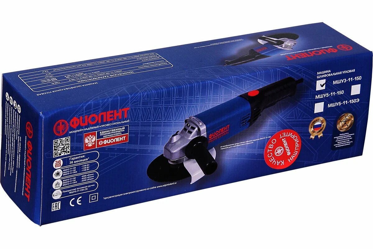 Машина шлифовальная угловая ручная электрическая МШУ3-11-150 - изделие на 90% состоит из деталей и комплектующих отечественного производства, компактная двуручная машина для зачистки, шлифовки и резки различных материалов, в т.ч. для обработки бетона, кирпича, камня и других стройматериалов соответствующими кругами, легкий прочный корпус редуктора из нового магниевого сплава обеспечивает стабильную и продолжительную работу механизма в самых тяжелых условиях, двойная изоляция привода, мощность 1100 Вт, скорость вращения 8500 об/мин, диаметр диска 150 мм, резьба ведущего шпинделя М14, гарантийный срок эксплуатации - 24 мес.+ 12 месяцев при регистрации изделия на официально сайте производителя.