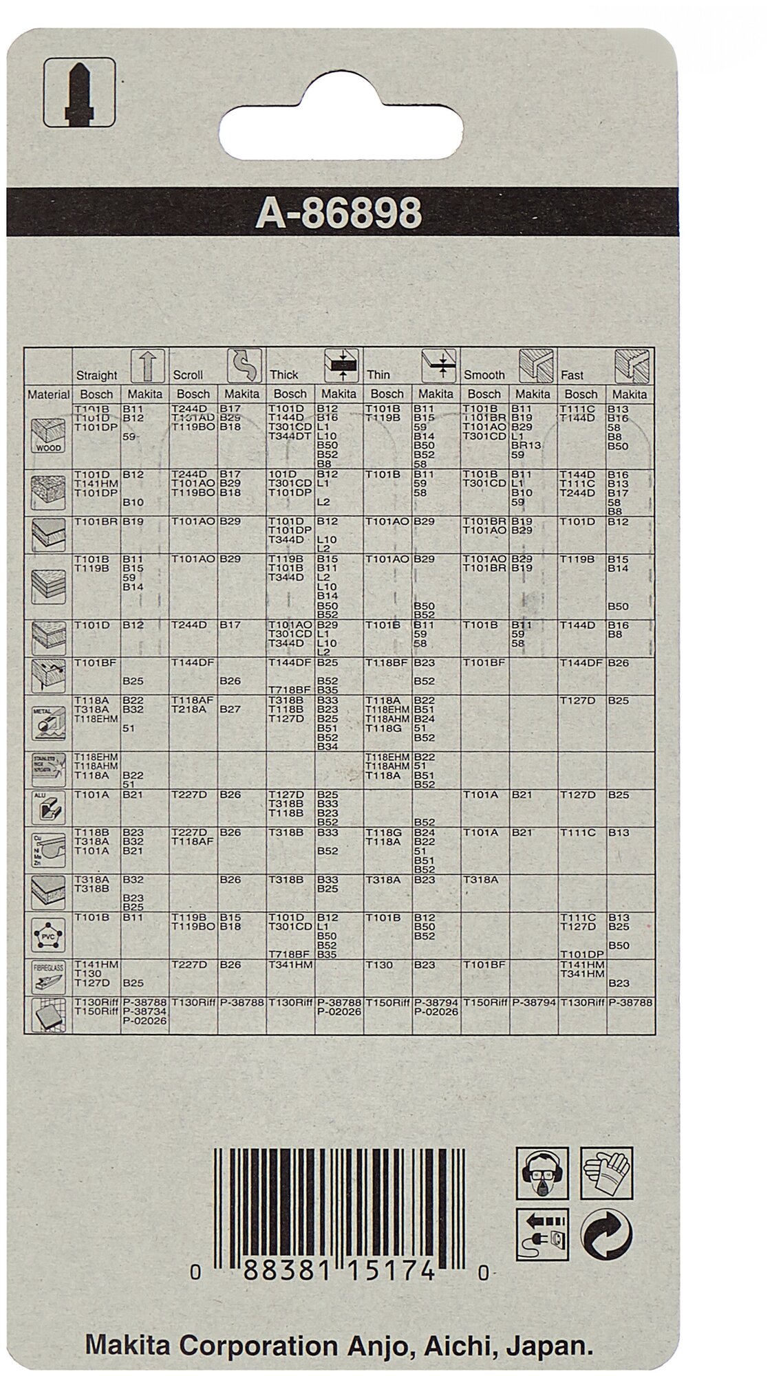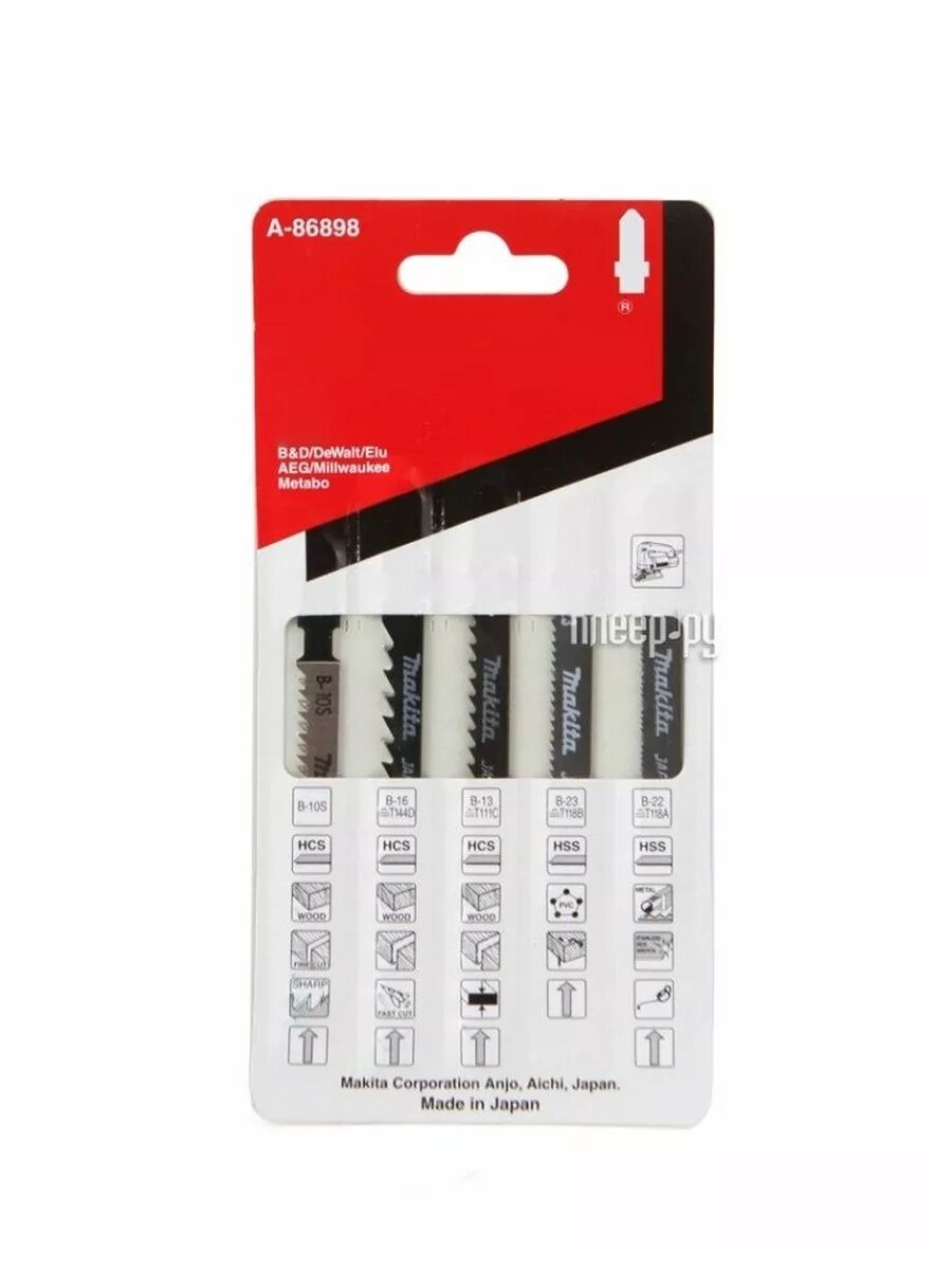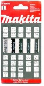| Прочие характеристики и свойства | Пилки для лобзика Makita - 5 шт (B-10S,B-13,B-16,B22,B-23) в комплекте. 1. Чистый пропил по дереву 2. Очень быстрый и грубый пропил по дереву 3. Грубый пропил по дереву и многослойным материалам 4. Пропил по древесине с остатками металла и пластмассам 5. Пропил по тонкой стали и цветным металлам |