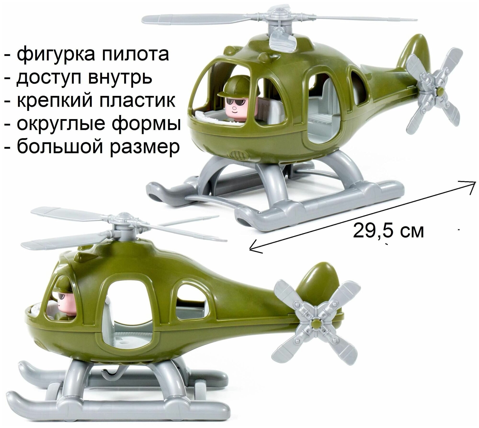 Вертолёт военный "Гром" от фабрики "Полесье" - это игрушка, которая имеет округлую форму и стильный дизайн. Лопасти вертолёта подвижны, это позволяет сделать игру более реалистичной и захватывающей. Кабина имеет окна и оснащена сиденьями, одно из которых занимает фигурка пилота. Также конструкция вертолёта предполагает наличие шасси с колёсиками. Они позволяют передвигать игрушку по плоской поверхности и способствуют созданию различных игровых сценариев. Вертолёт выполнен в зелёном цвете.