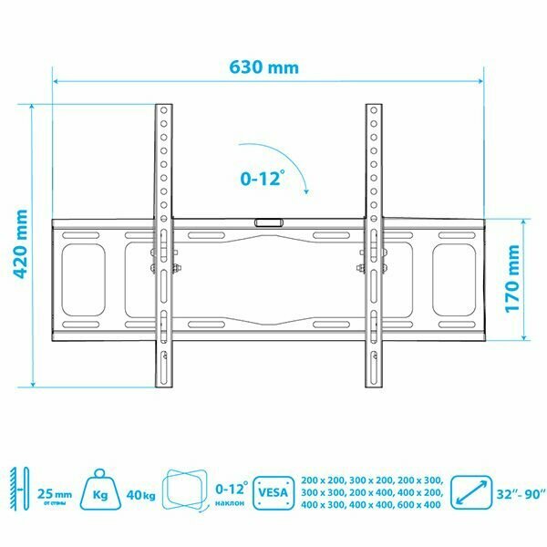 Кронштейн Tuarex OLIMP-112 black настенный для TV 32"-90" угол наклона 0-12 макс нагр 40 кг VESA 600x400