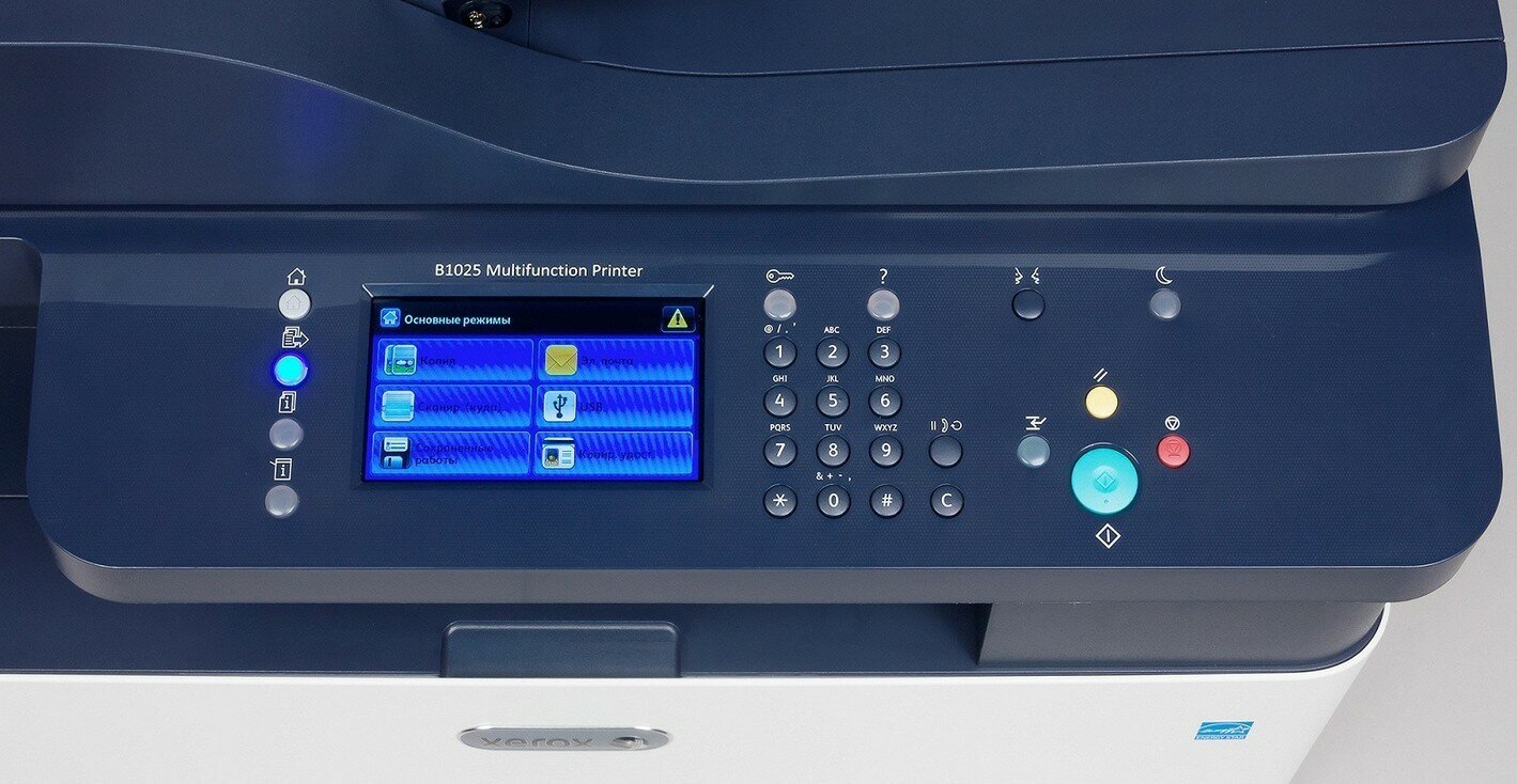 - Монохромный МФУ Xerox B1025DNA формата A3: дуплекс, автоподатчик оригиналов и Ethernet-адаптер