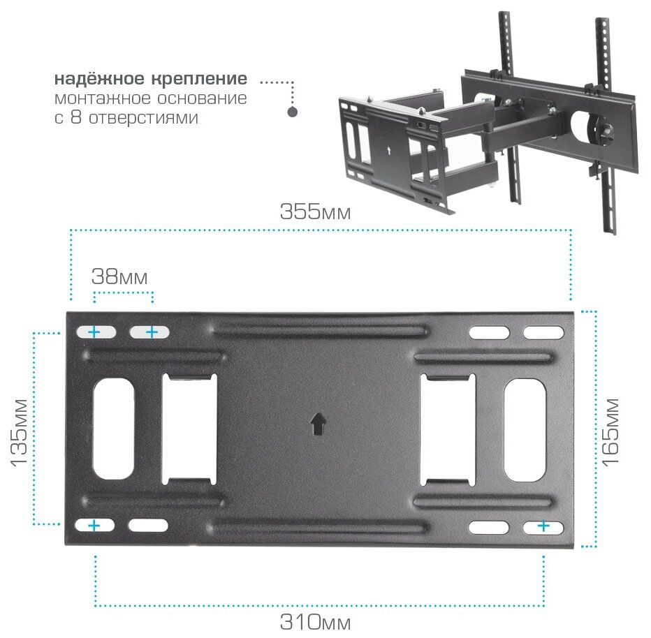 | Дополнительно | Надежная стальная конструкция, Втроенный водяной уровень, Универсальная система крепления, Вращение экрана относительно стены ±5°, Защита от падения |