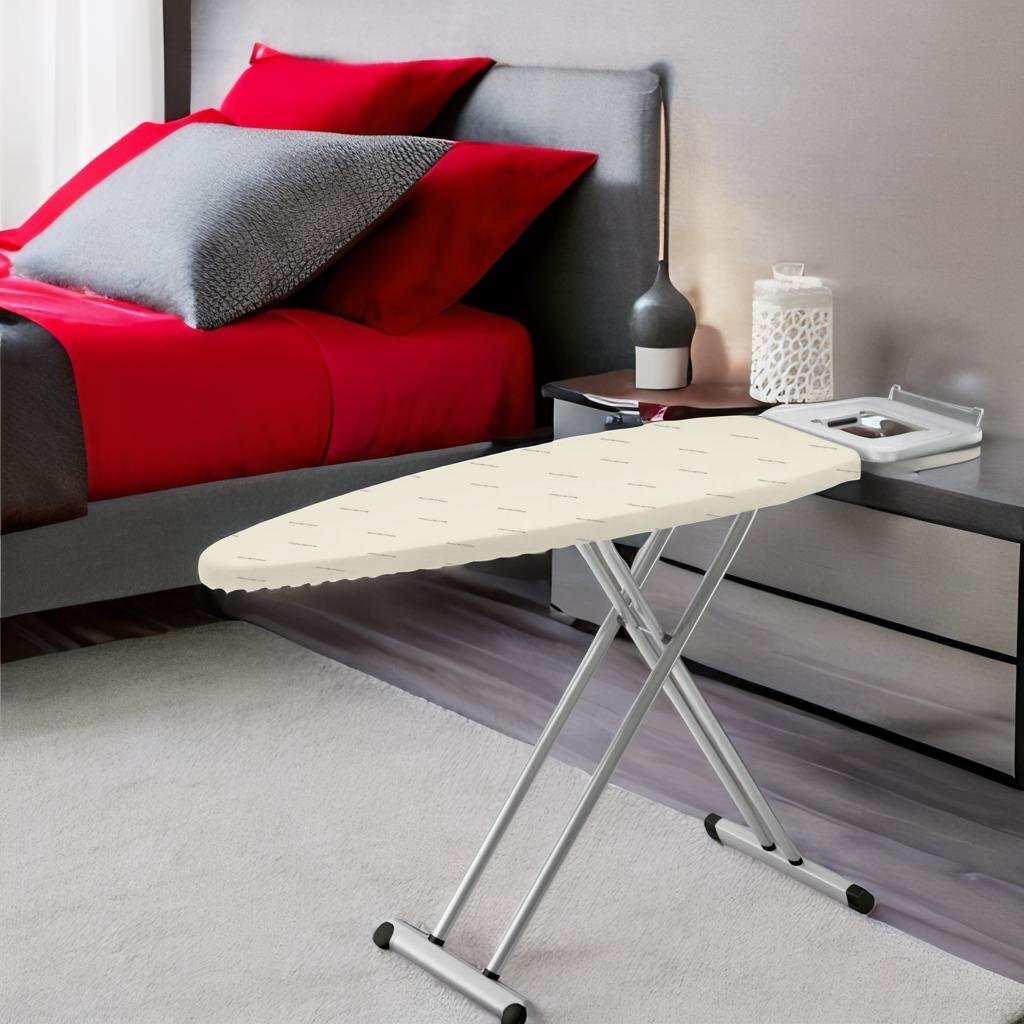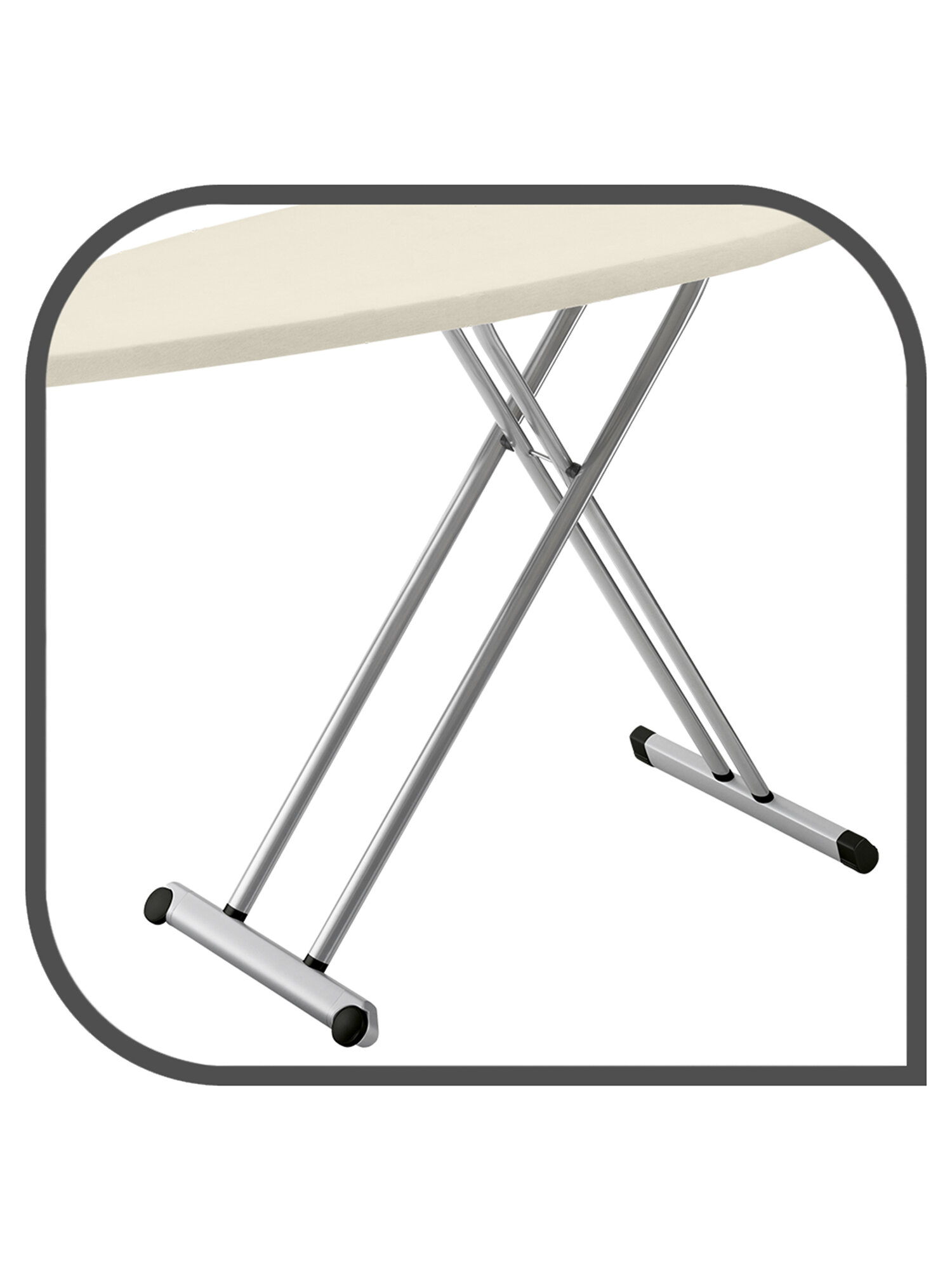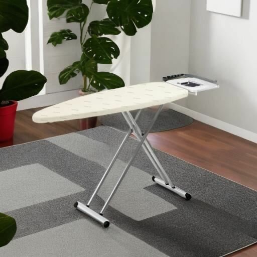 Качество доски на высоте, очень приятно ей пользоваться. Рада, что приобрела именно эту Tefal-ую модель. Великолепно подходит под парогенератор, с хорошей крепкой полкой и специальным кронштейном под вешалки. Материал листа нержавеющий, щедро обработан антикорозийкой, достаточно плотный, абсолютно ровный и самый достойный плюс – поверхность большая и широкая. Проглаживать шторы или «немаленькие» вещи очень удобно, никакого стеснения и напряга. Подстраивается регулятором под любой рост, можно и сидя поутюжить на диване. Устойчивая – да! Стоит не шелохнется, выдерживает оптимальную нагрузку, а если надо переместить, то для этого предусмотрены колеса с одной стороны, и нет! – они не царапают поверхность пола.