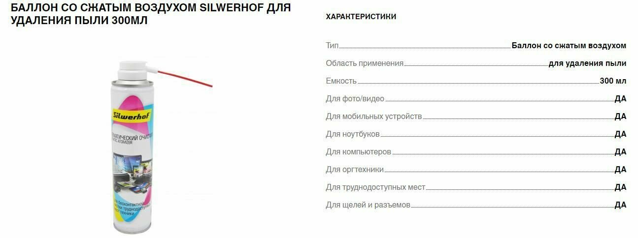 На сегодняшний день товар «Баллон с сжатым воздухом Silwerhof 671501 300 мл Баллон со сжатым воздухом для удаления пыли» можно купить с кешбеком в 1 магазине: Яндекс.Маркет