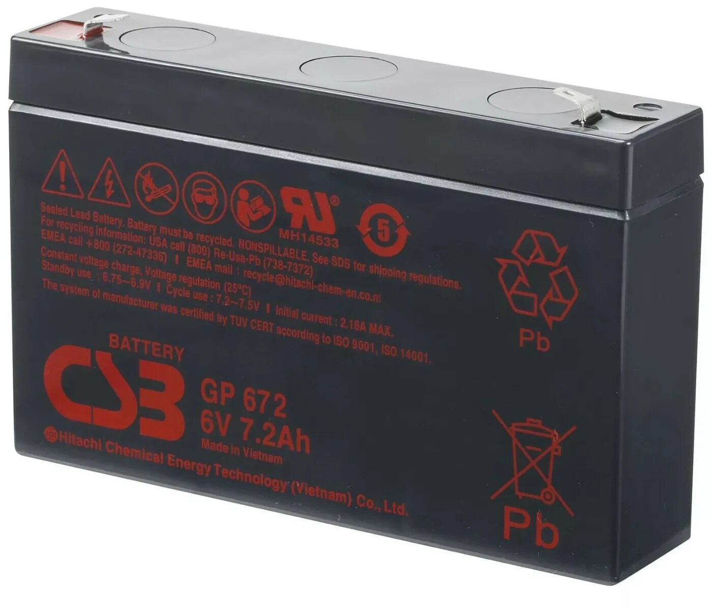 GP 672 - батарея общего применения со сроком службы 5 лет. В буферном режиме или более 260 циклов заряда-разряда в циклическом режиме при 100% разряде. Как и все батареи CSB, она перезаряжаемая, высокоэффективная и не требующая обслуживания.