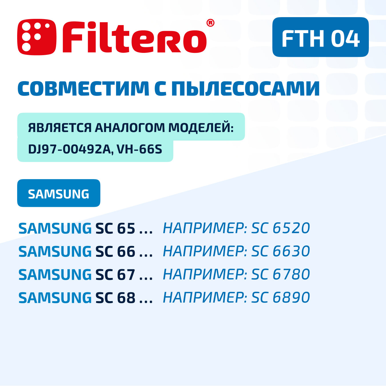 | Совместимые модели пылесосов | SAMSUNG SC 65… серии, SC 66... серии; SC 67… серии; SC 68… серии |