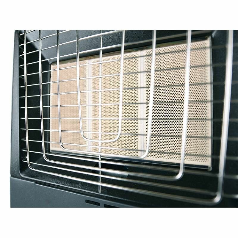 Это прибор с комбинированной системой обогрева, который может работать как автономно, так и от электропитания, что дает возможность устанавливать его практически где угодно. Прибор функционирует в трех режимах мощности, обогревая помещения площадью до 60 м. кв. Бесперебойная работа на протяжении многих лет достигается благодаря многоуровневой системе безопасности, в которую входит: защитная термопара для контроля пламени, датчики аварийного отключения при опрокидывании и превышении уровня углекислого газа. Кроме того, специальный фиксатор предотвращает случайное выпадение баллона при перемещении прибора.