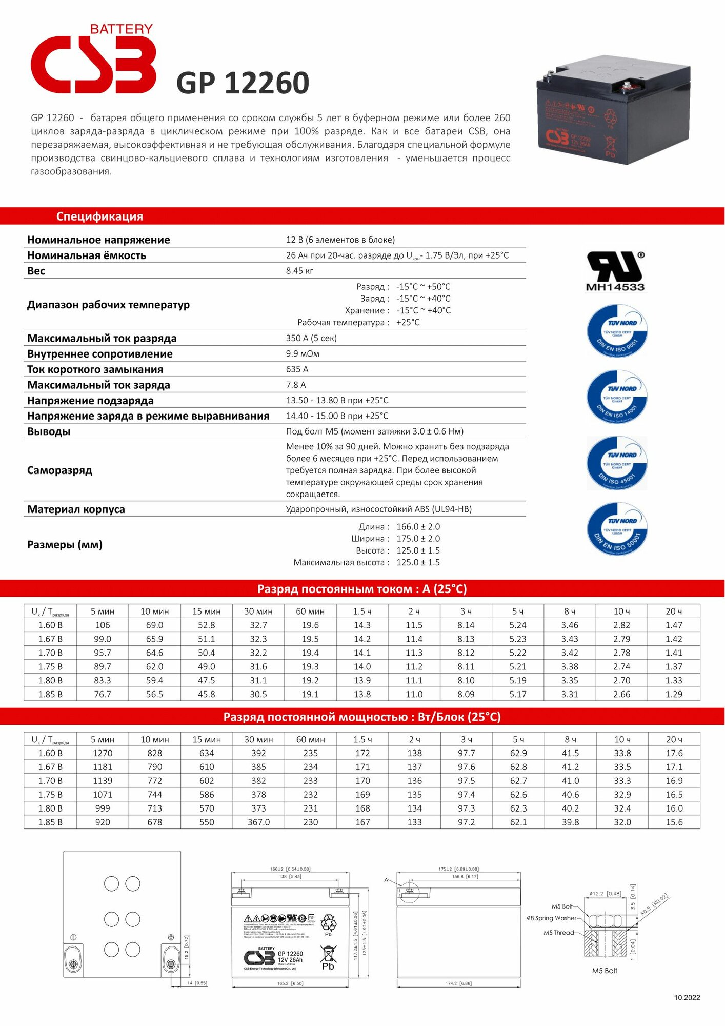 CSB GP 12260 (12 В, 26 Ач) является одним из самых распространённых свинцово-кислотных аккумуляторов общего назначения. Корпус батареи выполнен из долговечного ABS-пластика и имеет предохранительный клапан для сброса избыточного давления. Аккумулятор полностью герметичен (не требует долива воды), а значит может работать в любом положении. CSB GP 12260 выполнен по технологии AGM (стекловолоконный сепаратор, пропитанный жидким электролитом). Срок службы достигает 5 лет или около 260 циклов при 100% разряде. Дата производства аккумулятора CSB GP 12260 указана на крышке в виде символьного кода.Аккумуляторная батарея CSB GP 12260 имеет усовершенствованную конструкцию легированных кальцием электродов из особо чистого свинца, что обеспечивает продолжительный срок службы и улучшенные разрядные характеристики.