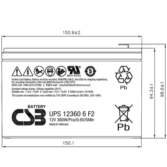 | Описание | Аккумуляторные батареи CSB серии UPS - серия батарей со сроком службы до 5 лет (или до 260 циклов до 100% разряда при работе в циклическом режиме), высокой мощности при малых массогабаритных показателях. |