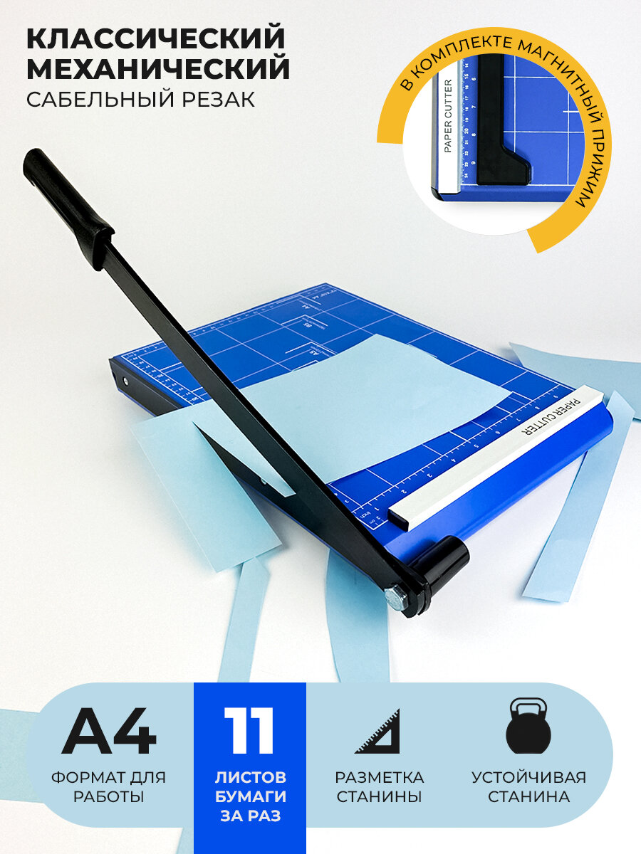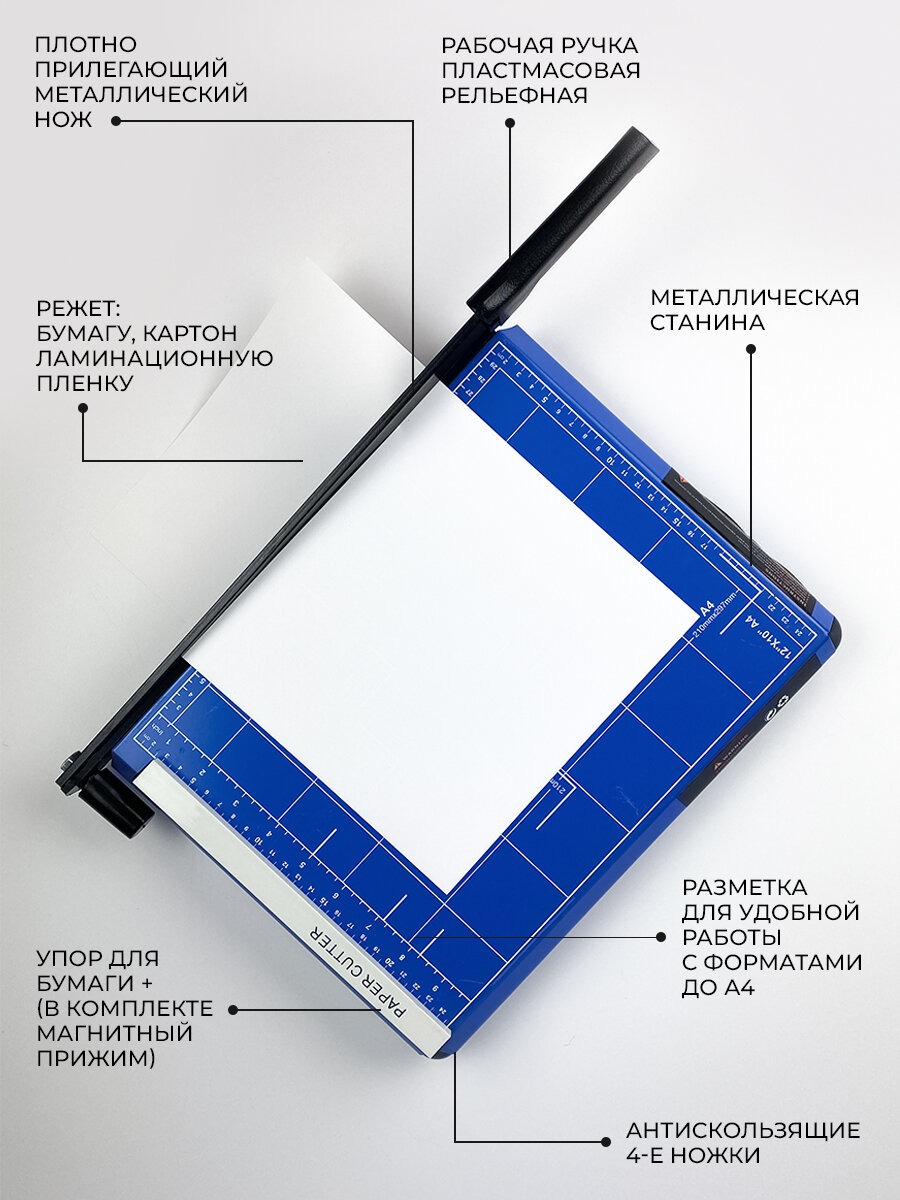 | Дополнительно | Сабельный резак с механическим прижимом для фиксации листов формата А4., Рабочая поверхность имеет удобную разметку для правильного позиционирования. |
