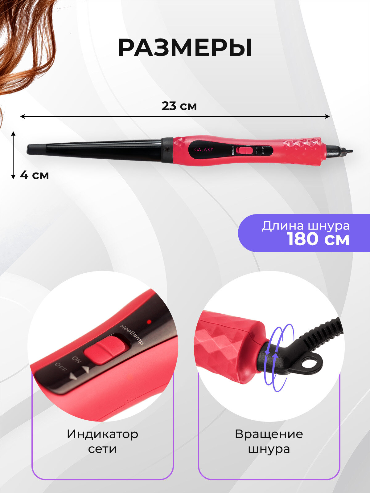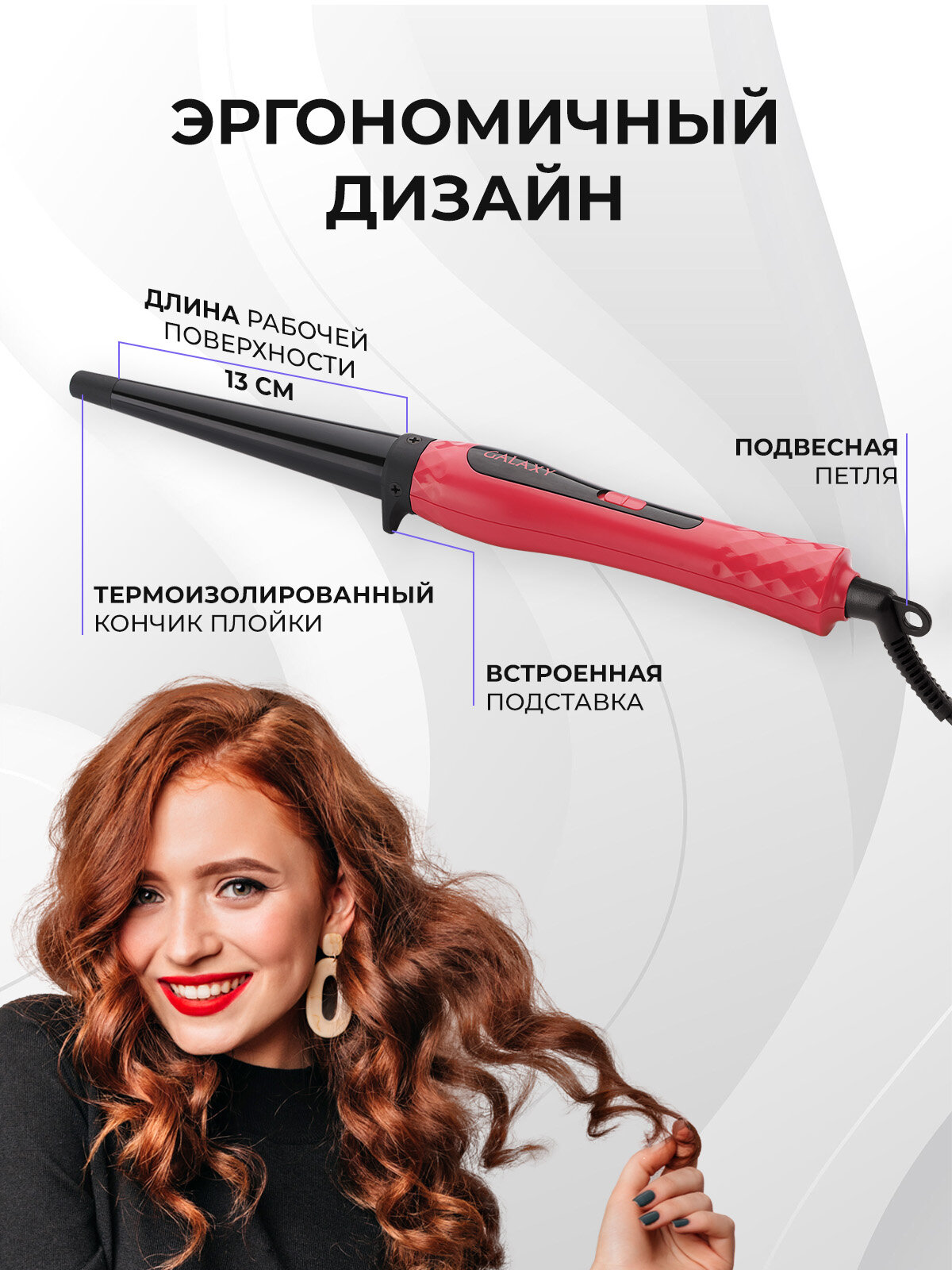 Надежная и функциональная конусная плойка GALAXY GL4623 создана для создания стойких, упругих локонов красивой формы. Может использоваться на волосах любого типа, прекрасно справляется с завивкой самых непослушных волос. Форма плойки эргономична, ручка с прорезиненным покрытием, не скользит. Наконечник не нагревается. Благодаря керамическому покрытию рабочей поверхности волосы не пересушиваются, становятся шелковистыми и блестящими.