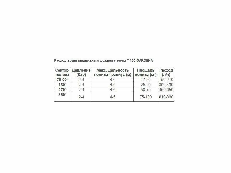 | Прочие особенности и свойства | Площадь полива Min:50 м?,Площадь полива Max:100 м?,Радиус полива Min |