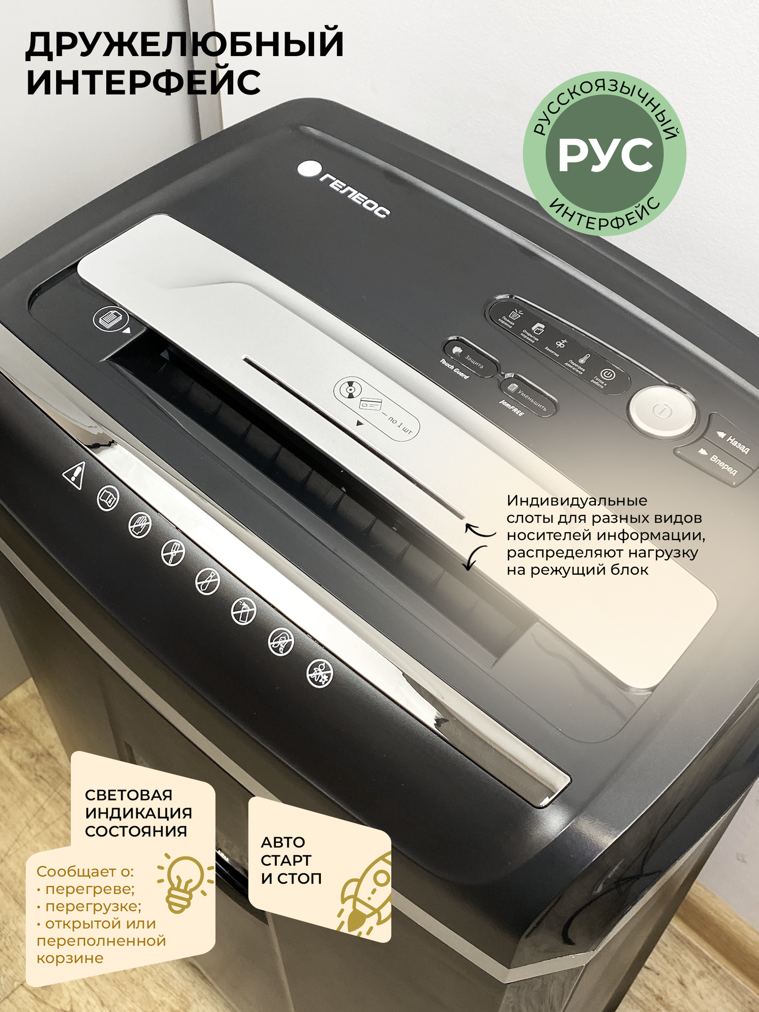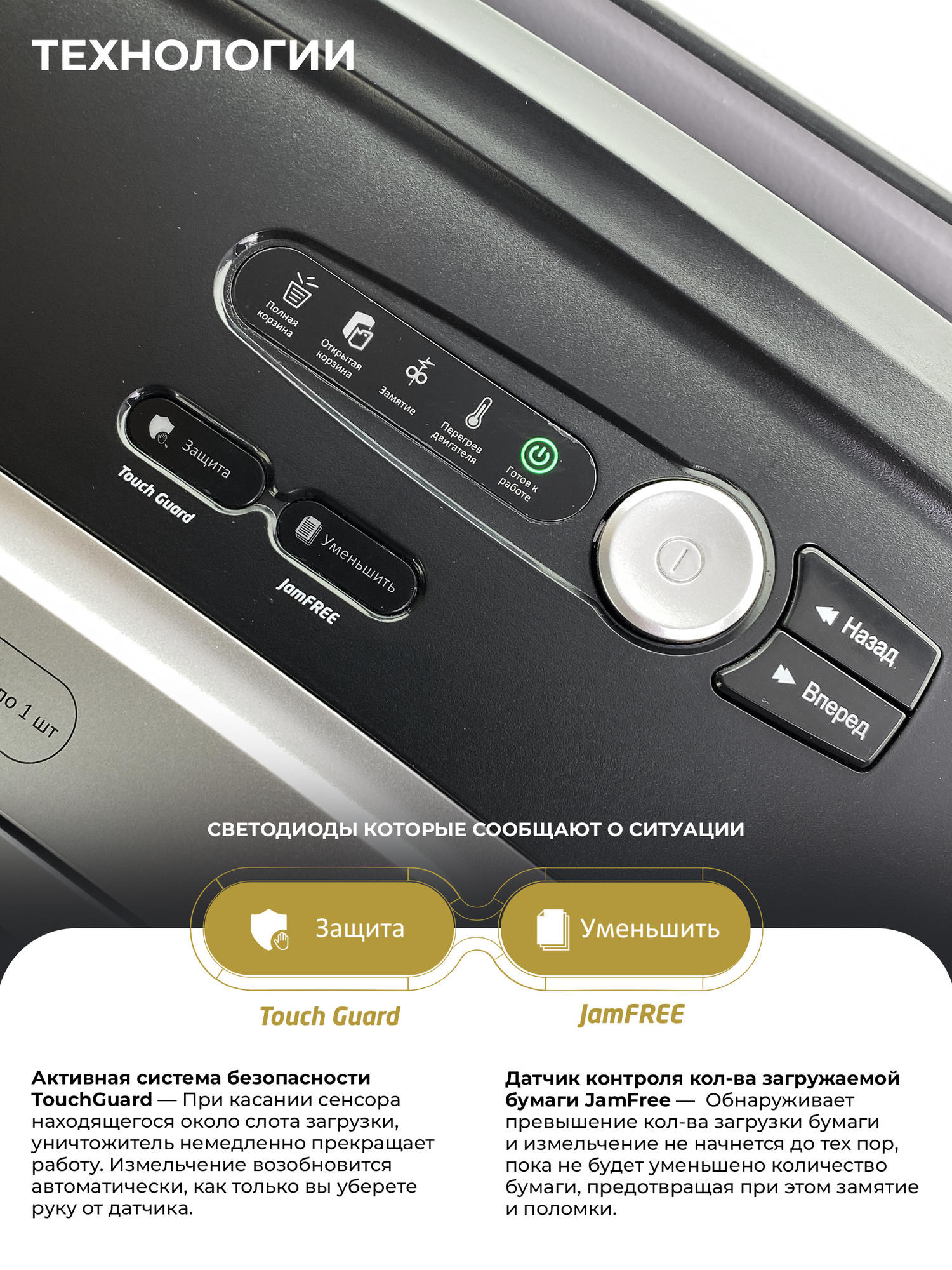 | Прочие особенности и свойства | TouchGuard (Активная система безопасности) - экстренная остановка уничтожения при прикосновении JamFree (Защита от перегрузки) - система защиты от перегрузки по количеству листов |