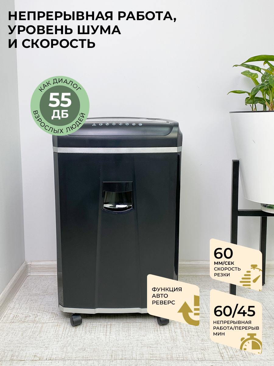 Высокая производительность:за счет автоматически включающихся кулеров охлаждения при уничтожении данная модель позволяет совершать непрерывную переработку в течение 60 минут.Предупреждение! Во избежание преждевременных поломок при продолжительном уничтожении рабочий цикл должен быть 60/45 мин.