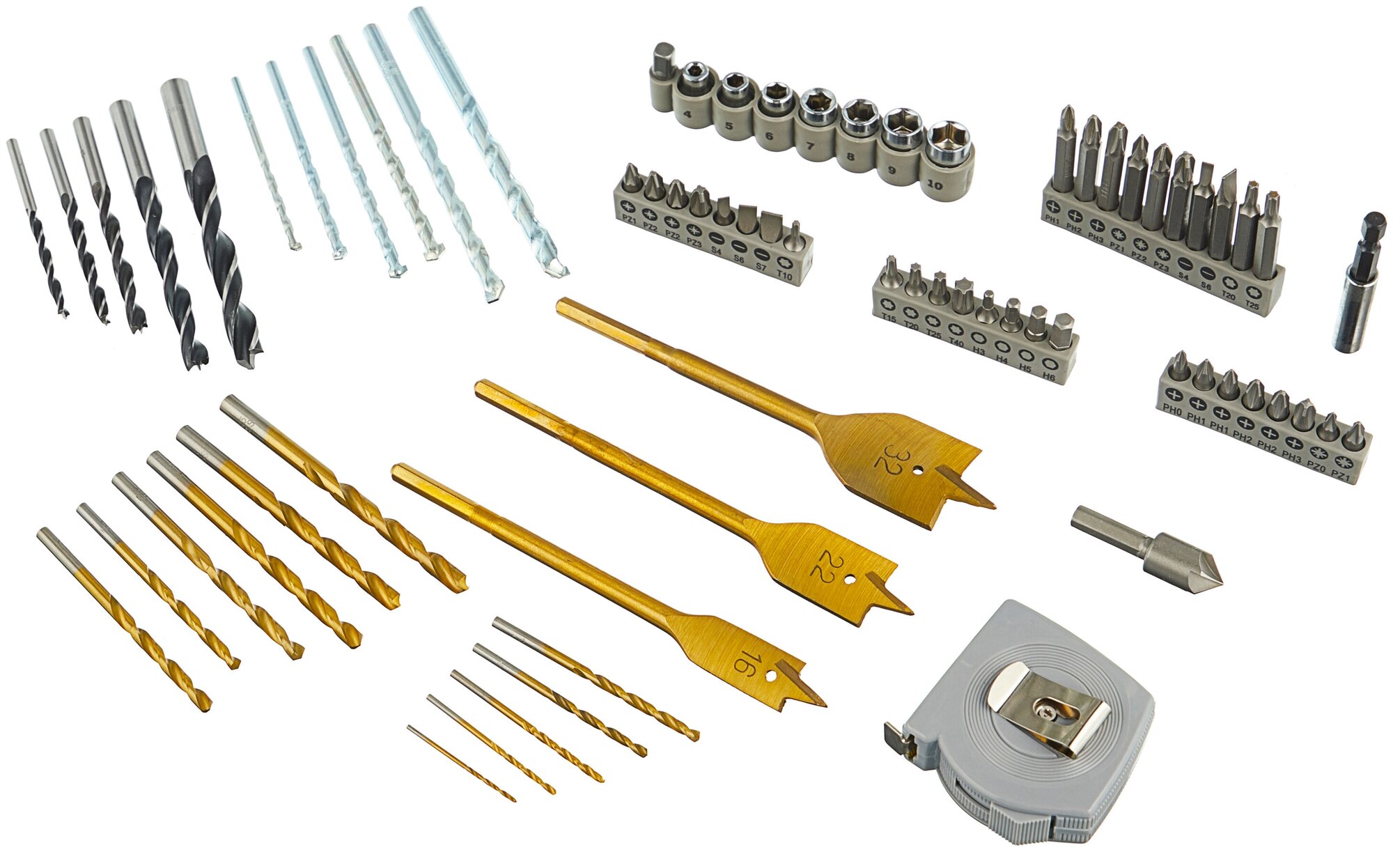 | Комплект поставки | 11 сверл по металлу HSS-TIN O1.5 мм — 6.5 мм, 6 сверл по камню HM O4 мм -10 мм, 5 сверл по древесине 4 мм -10 мм, 3 плоскофрезных сверла, титан, O16/22/32 мм, 24 насадки-биты L=25 мм, ЗР 0/1/1/2/2/3, PZ 0/1/1/2/2/3, SL 4/6/7, HEX 3/4/5/6, T 10/15/20/25/40, 10 насадок-бит L=50 мм, PH 1/2/3, SL 4/6, T 20/25, 7 торцовочных ключей 4/5/6/7/8/9/10 мм, Переходник для торцовочных ключей, Измерительная рулетка, Шаблон диаметров, Универсальный магнитный держатель, Зенкер |