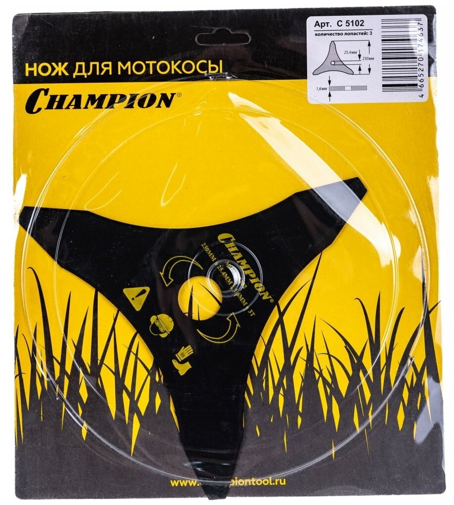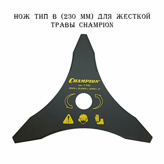 Нож для жесткой травы Champion тип В. Количество зубьев - 3. Внешний диаметр 230мм. Диаметр посадочного отверстия 25,4мм.