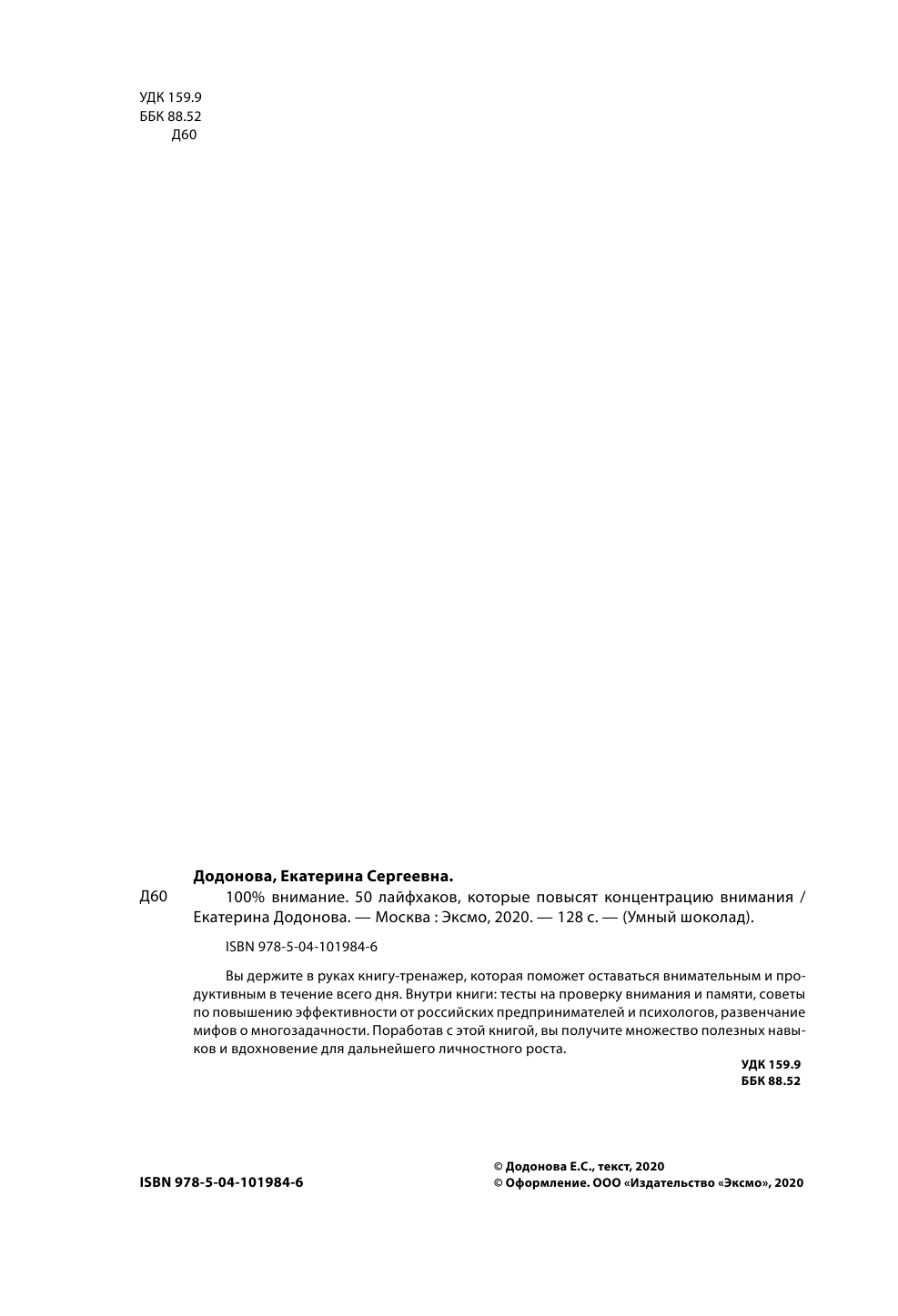 100% внимание. 50 лайфхаков которые повысят концентрацию внимания (Екатерина Додонова); Эксмо, 2020