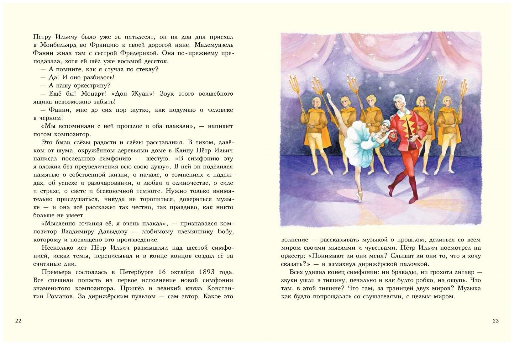 В книге много диалогов, именно они помогают глубже погрузиться в ощущения и переживания сначала юного, потом зрелого композитора, познакомиться с людьми, которые его окружали, которых он любил. Книга будет особенно близка ребенку еще потому, что в ней много интересных фактов из раннего детства Петра Ильича. Например, его сильнейшие переживания, когда он увидел мертвого шмеля, или история, как он разбил стекло, выстукивая на нем ритм, потому что родители закрыли рояль на ключ.