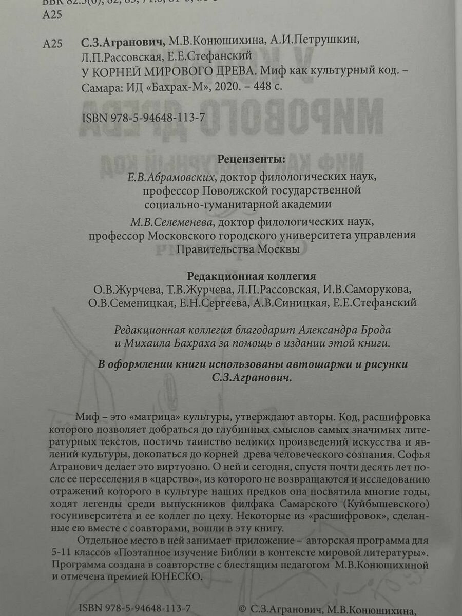 Миф - это "матрица" культуры, утверждают авторы. Код, расшифровка которого позволяет добраться до глубинных смыслов самых значимых литературных текстов, постичь таинство великих произведений искусства и явлений культуры, докопаться до корней древа человеческого сознания. Софья Агранович - делает это виртуозно. О ней и сегодня, спустя почти десять лет после ее переселения в "царство", из которого не возвращаются и исследованию отражений которого в культуре наших предков, она посвятила многие годы, ходят легенды среди выпускников филфака Самарского (Куйбышевского) госуниверситета и ее коллег по цеху. Некоторые из "расшифровок", сделанные ею вместе с соавторами, вошли в эту книгу.