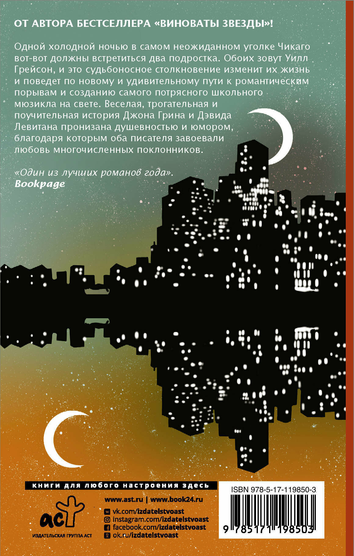 Одной холодной ночью в самом неожиданном уголке Чикаго вот-вот должны встретиться два подростка. Обоих зовут Уилл Грейсон, и это судьбоносное столкновение изменит их жизнь и поведет по новому и удивительному пути к романтическим порывам и созданию самого потрясного школьного мюзикла на свете. Веселая, трогательная и поучительная история Джона Грина и Дэвида Левитана пронизана душевностью и юмором, благодаря которым оба писателя завоевали любовь многочисленных поклонников.