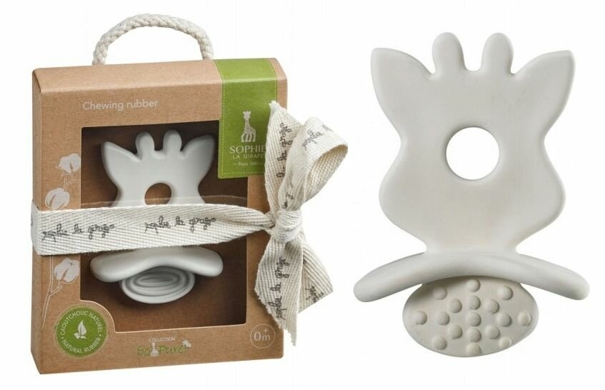 Маленький и легкий прорезыватель, малышу удобно держать его в ручках, изготовлен из натурального каучука. Очертания прорезывателя напоминают голову жирафа: ушки, рожки, одним словом, маленький непоседа сразу понимает, чем почесать зудящие десны и что попробовать на зуб. Нижняя часть прорезывателя, напоминающая язычок, двустороннаяя, с рифлеными рисунками, ее тоже можно грызть.