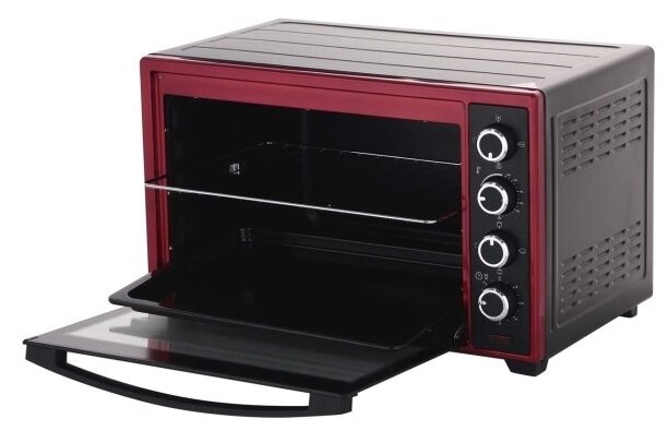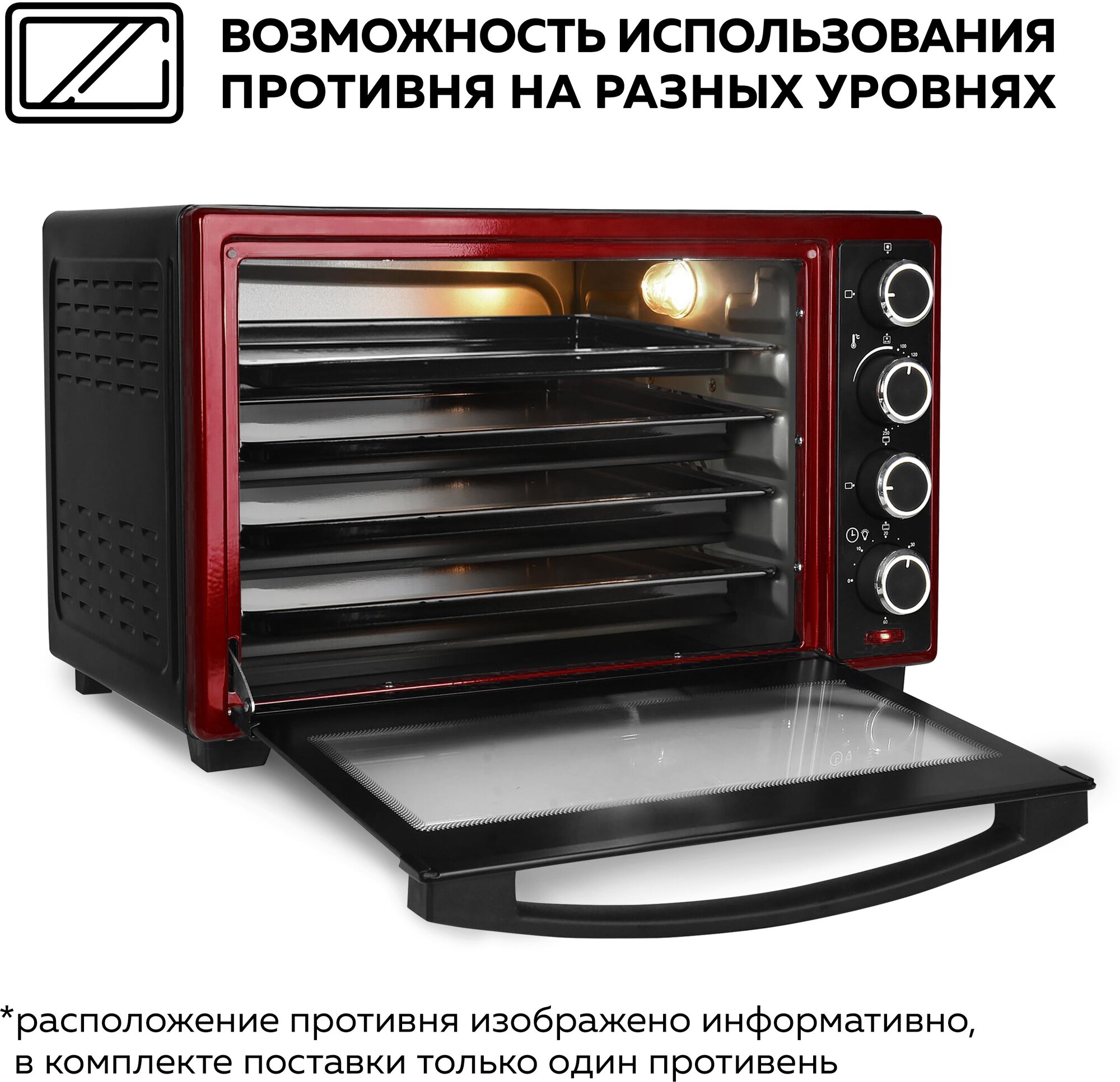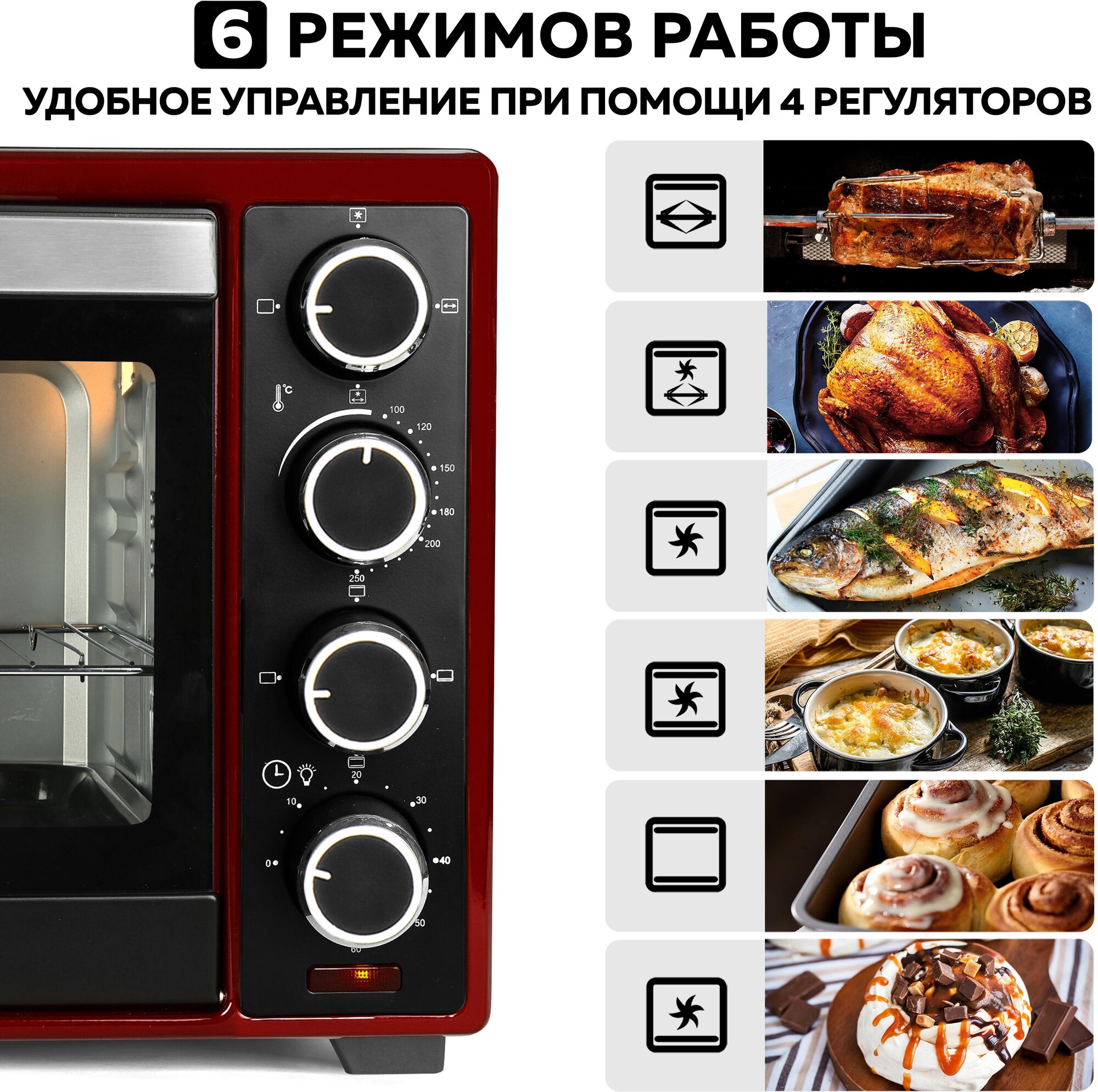 Электрическая многофункциональная мини-печь выполнена из нержавеющего металла в стильном дизайне черного цвета с элементами красного цвета. Высокая мощность 2000 Вт обеспечит быстрое приготовление продуктов. Отличительной особенностью этой модели является специальное антипригарное покрытие внутренней камеры, благодаря чему Вы без труда отчистите стенки печи от грязи, не оставив царапин и следов. Благодаря оптимальным размерам её легко как разместить на столе или шкафу в кухне, так и брать с собой на дачу или поездку. Внутренний объём 48 литров позволяет приготовить птицу на вертеле, мясо, пироги, рыбу и овощи на большую семью. Толстое закаленное стекло надежно защищает от жара и позволяет наблюдать за процессом приготовления. Внутри камеры расположен вентилятор для конвекции и лампочка для яркой подсветки. Также преимуществом данной модели является наличие вертела для гриля. В мини-печи предусмотрено 3 основные функции при различных сочетаниях конвекции, вертела и поочерёдного или одновременного включения верхнего и нижнего нагревательных элементов для приготовления продуктов. 1. Духовка с использованием режима конвекции, когда горячий воздух равномерно непрерывно циркулирует по камере, используется для прожарки и подогрева. 2. Гриль с режимом хрустящая корочка при использовании вертела и одновременной работы нагревательных элементов и конвекционного вентилятора. 3. Запекание с режимом выпечка. Также предусмотрен режим подогревания пищи после приготовления. Установить любой режим можно с помощью удобных механических регуляторов. Температура регулируется от 100° до 250° С, время приготовления и таймер отключения можно установить от 5 до 60 минут. После включения печи загорается индикатор включения. О завершении процесса приготовления оповестит звуковой сигнал. Мини-печь поставляется с противнем, металлической решеткой и зажимом для безопасного и лёгкого вынимания, а также с вертелом и держателем для вертела. Прорезиненные ножки способствуют устойчивости мини-печи на скользких поверхностях.